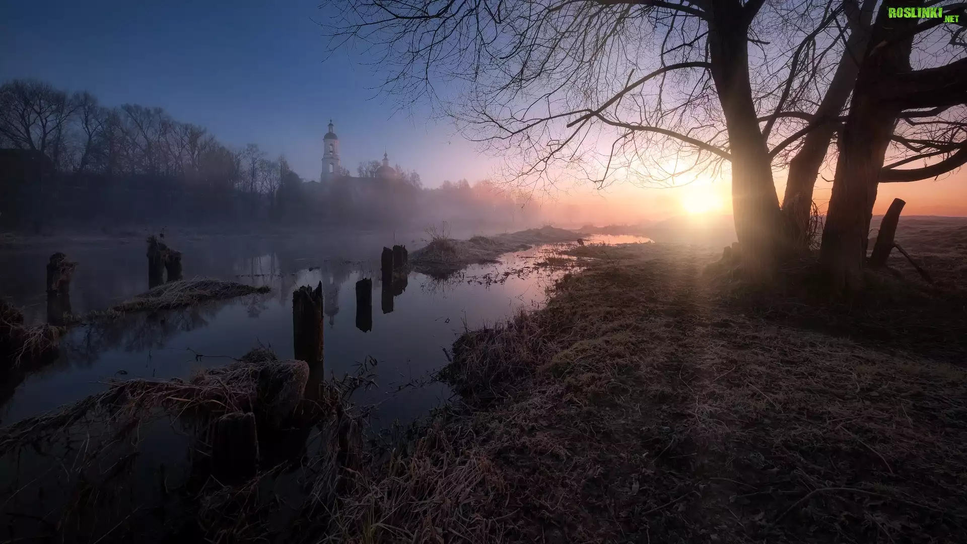 Rośliny: Poranek, Wschód słońca, Rzeka, Mgła, Cerkiew, Wieża, Drzewa