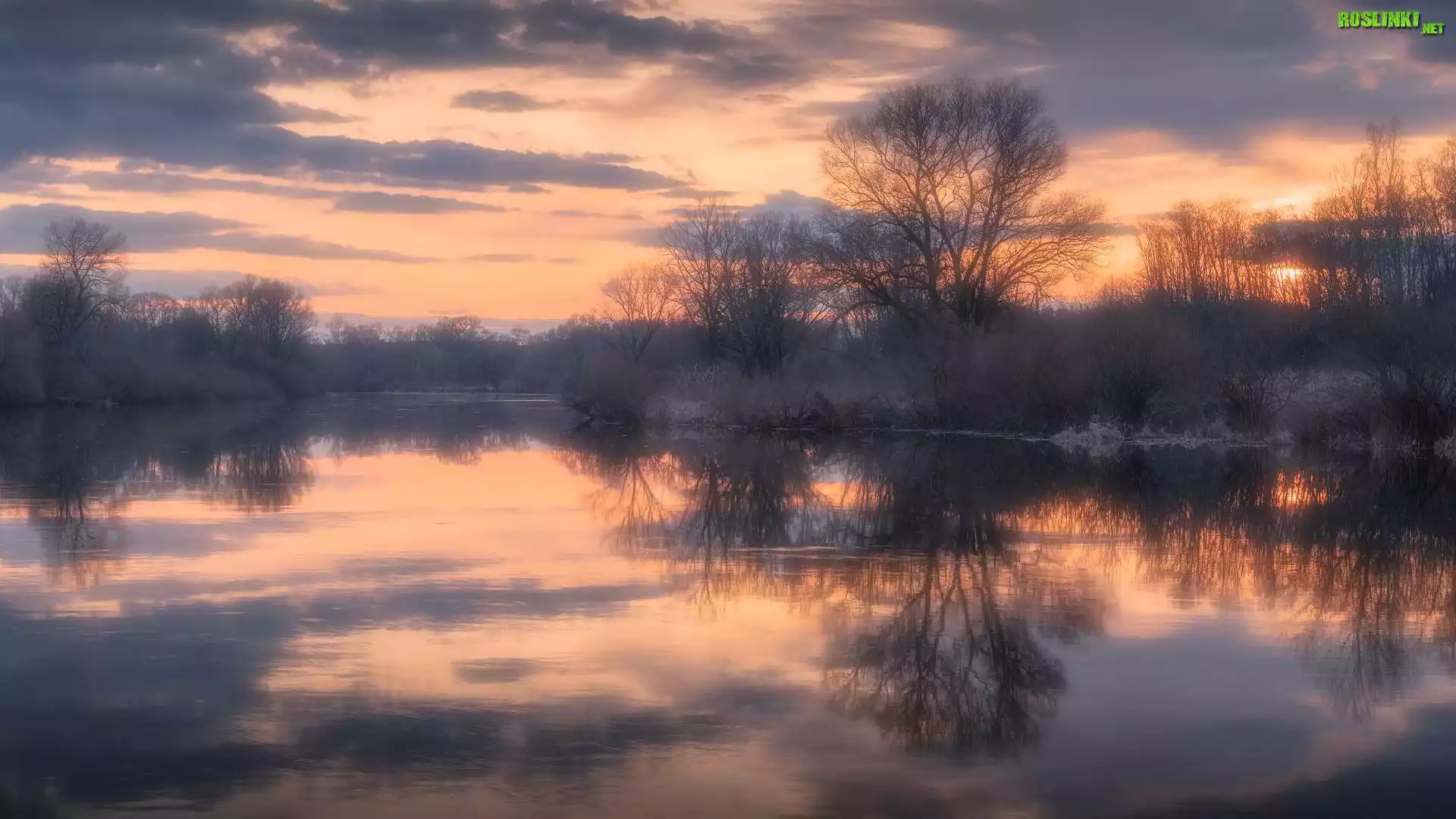 Wschód słońca, Rzeka, Drzewa, Odbicie