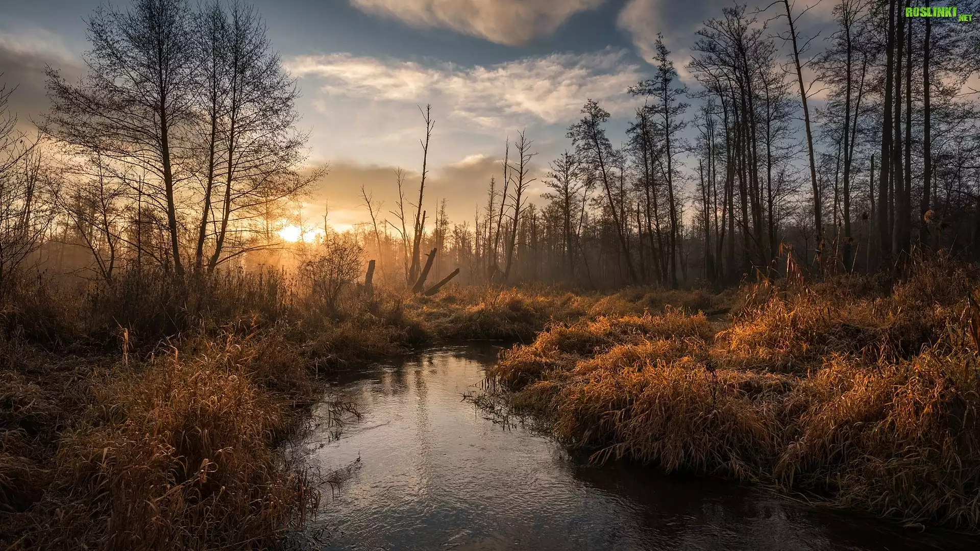 Rośliny: Wschód słońca, Rzeka, Drzewa, Rośliny