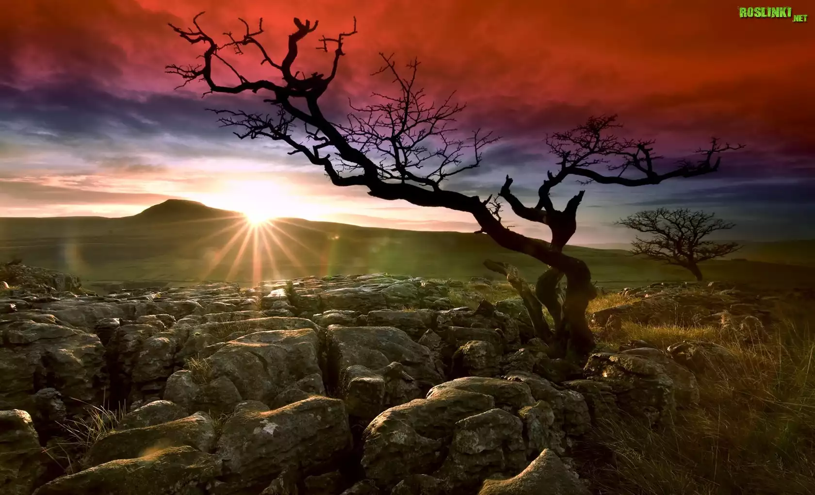 Rośliny: Wschód Słońca, Kamienie, Drzewo, Niebo