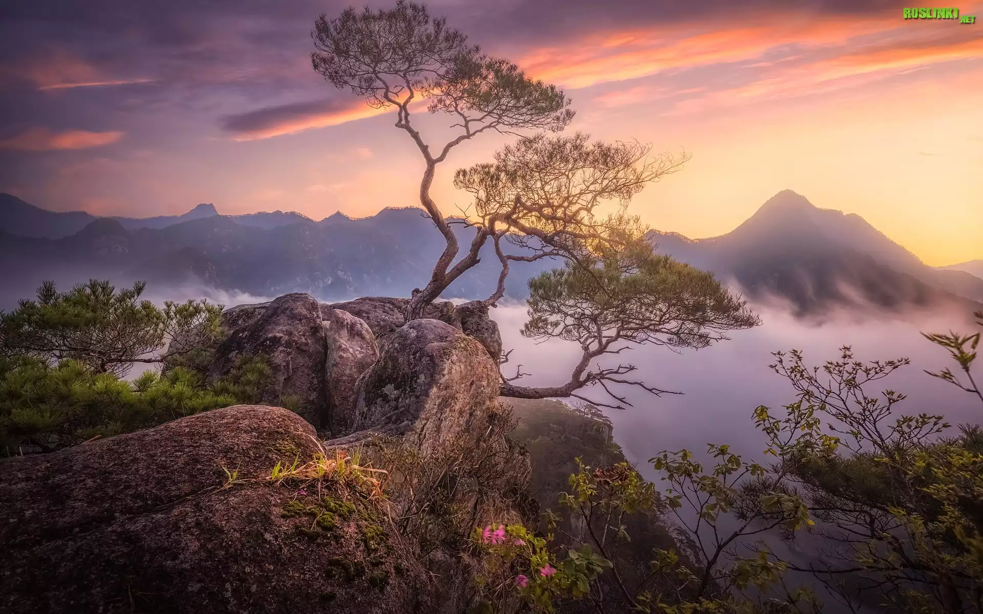 Góry, Skały, Drzewo, Wschód słońca, Kwiaty, Mgła