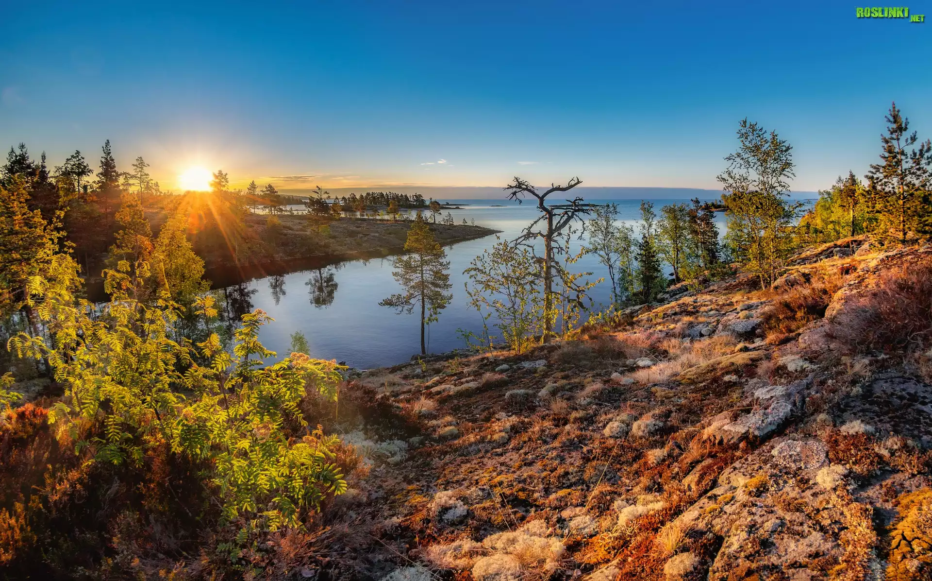 Rośliny: Jesień, Wschód słońca, Drzewa, Jezioro, Kamienie, Skały