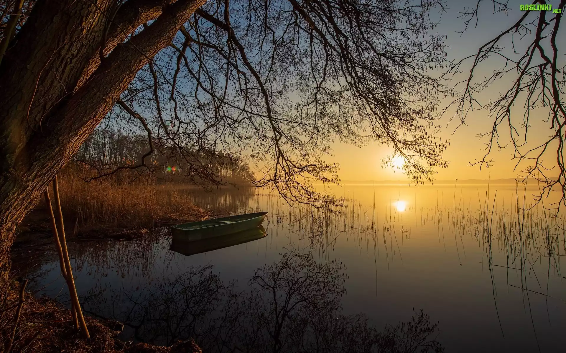 Rośliny: Jezioro, Wschód słońca, Drzewa, Szuwary, Łódka, Odbicie