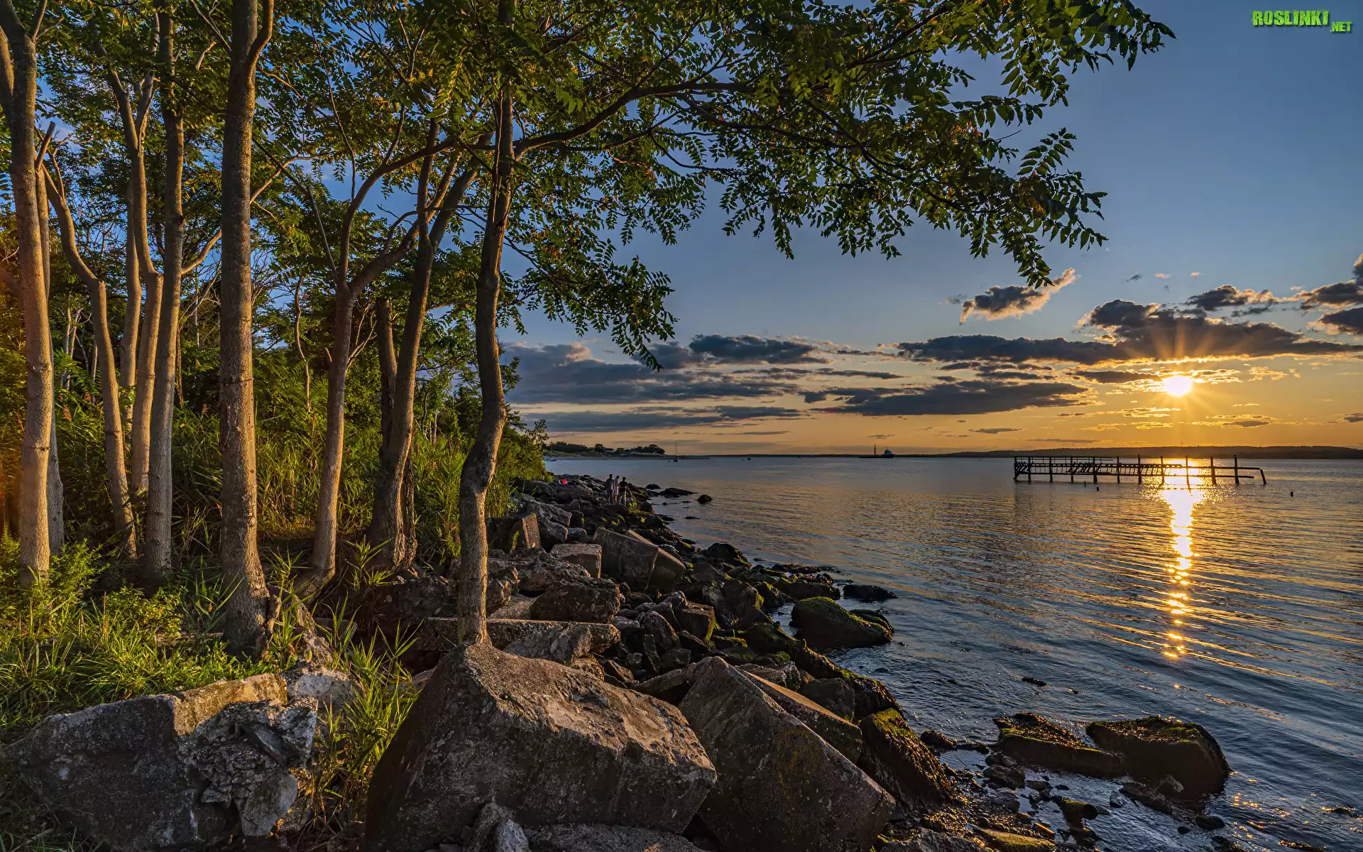 Rośliny: Wschód słońca, Jezioro, Kamienie, Drzewa