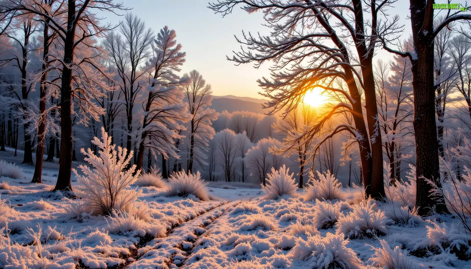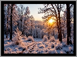 Rośliny: Zima, Drzewa, Las, Wschód słońca, Grafika AI