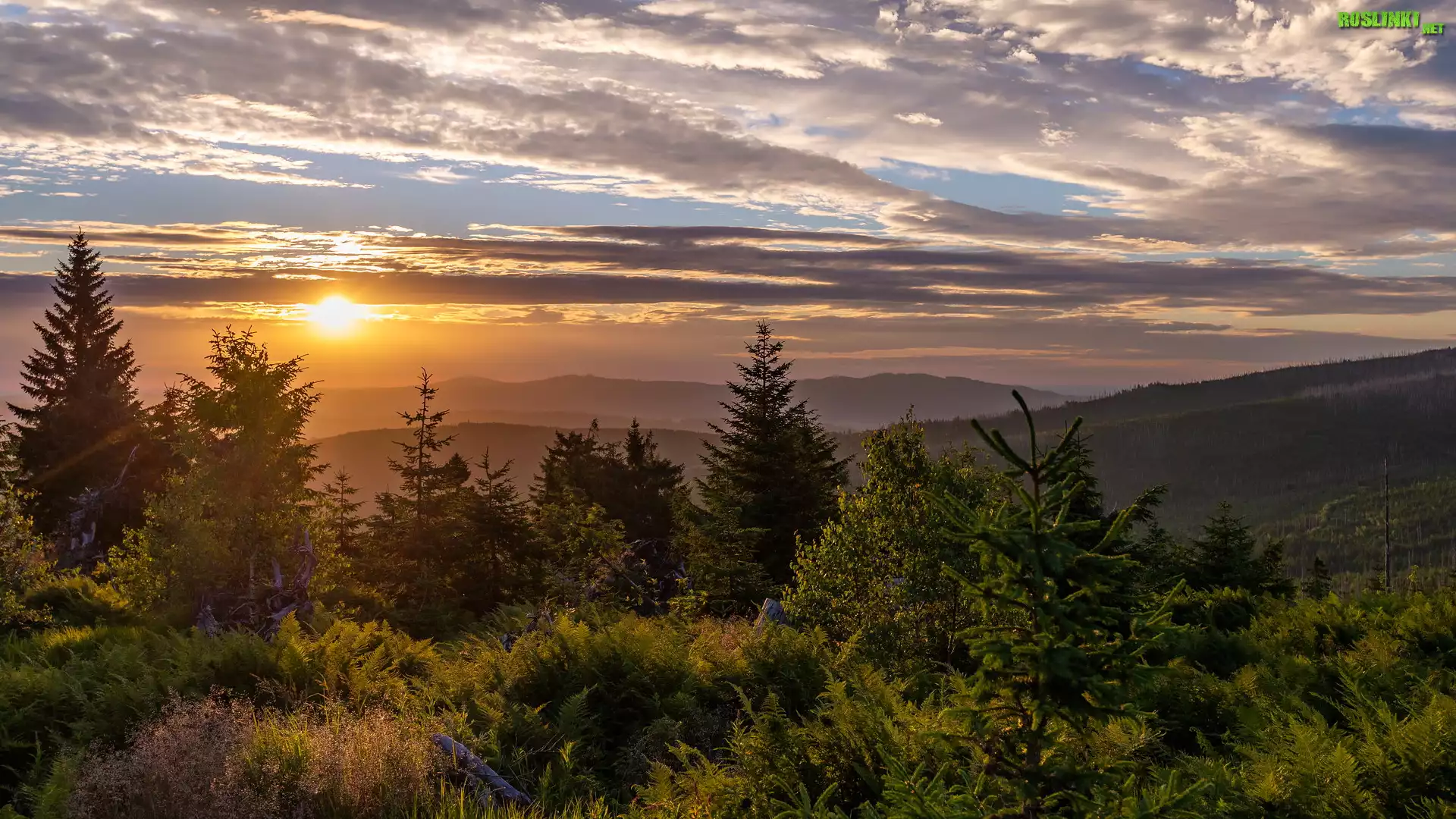 Rośliny: Wschód słońca, Chmury, Góry, Lasy, Drzewa