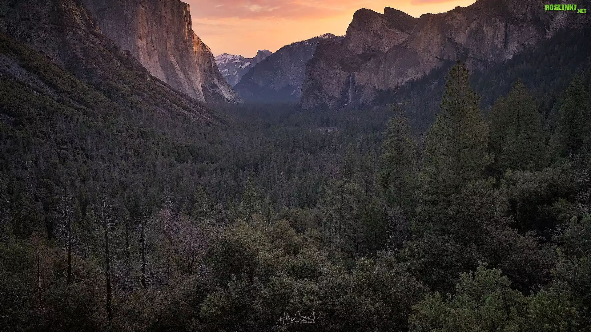 Wschód słońca, Park Narodowy Yosemite, Dolina Yosemite Valley, Drzewa, Lasy, Góry, Wodospad, Bridalveil Falls, Kalifornia, Stany Zjednoczone |