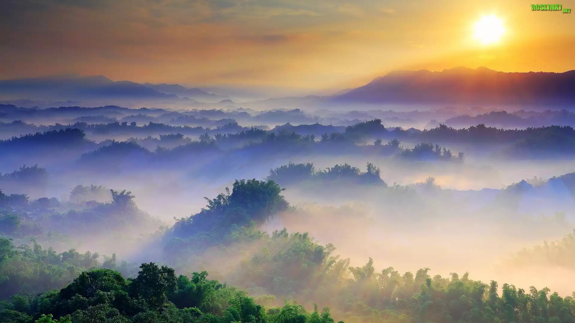 Rośliny: Wschód słońca, Mgła, Lasy, Drzewa