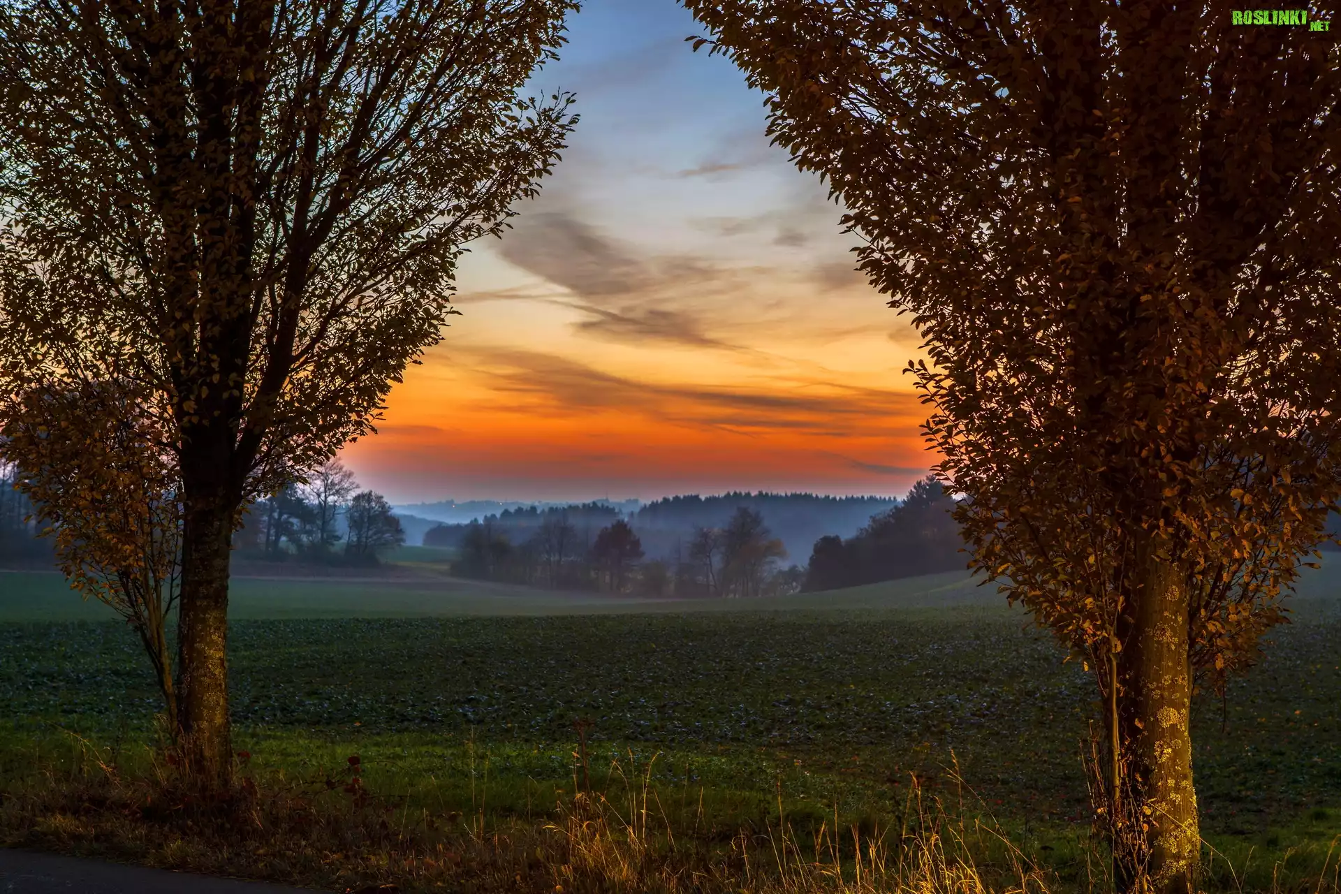 Wschód, Słońca, Pola, Mgła, Drzewa