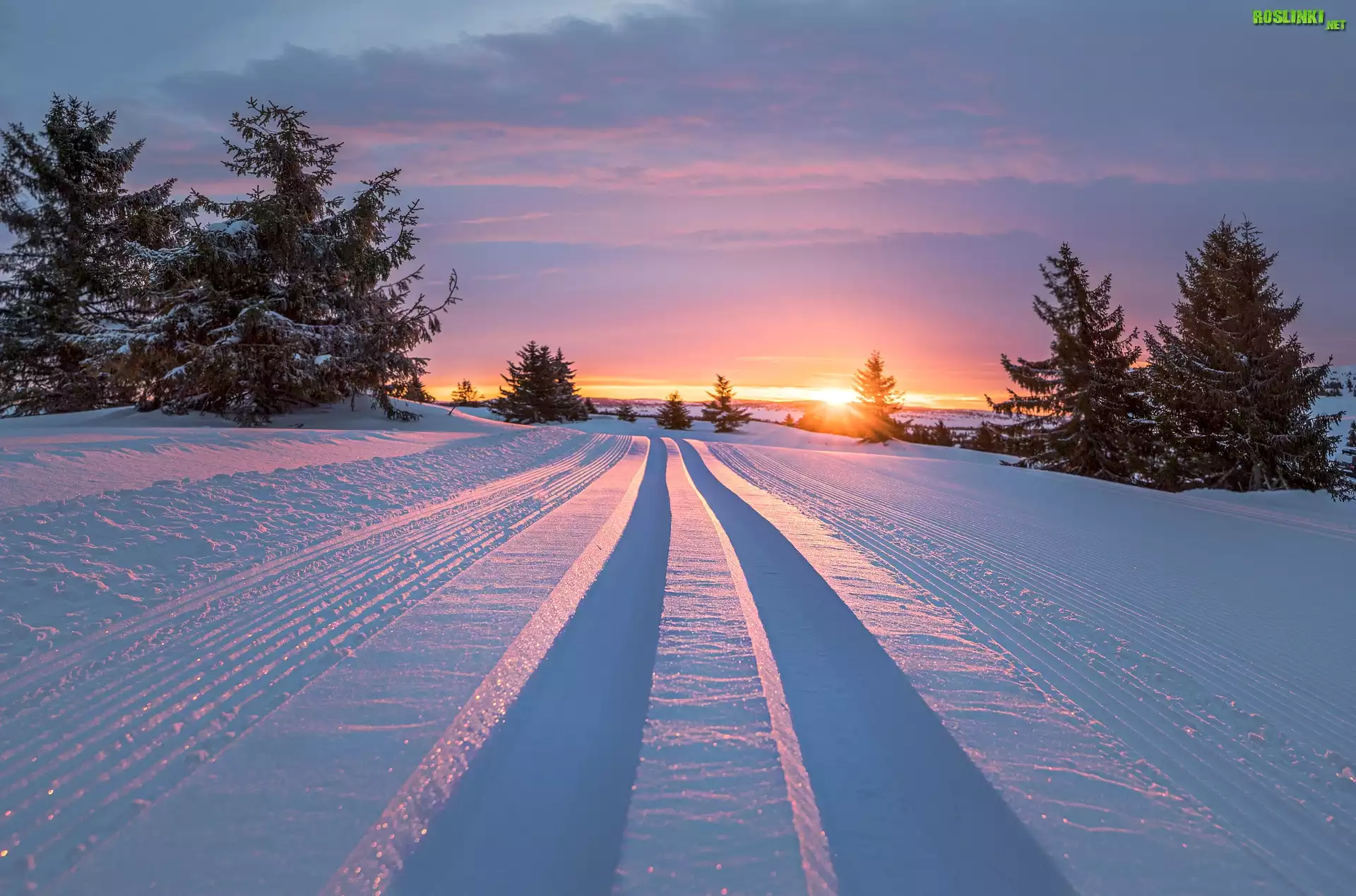 Rośliny: Wschód słońca, Zima, Śnieg, Drzewa