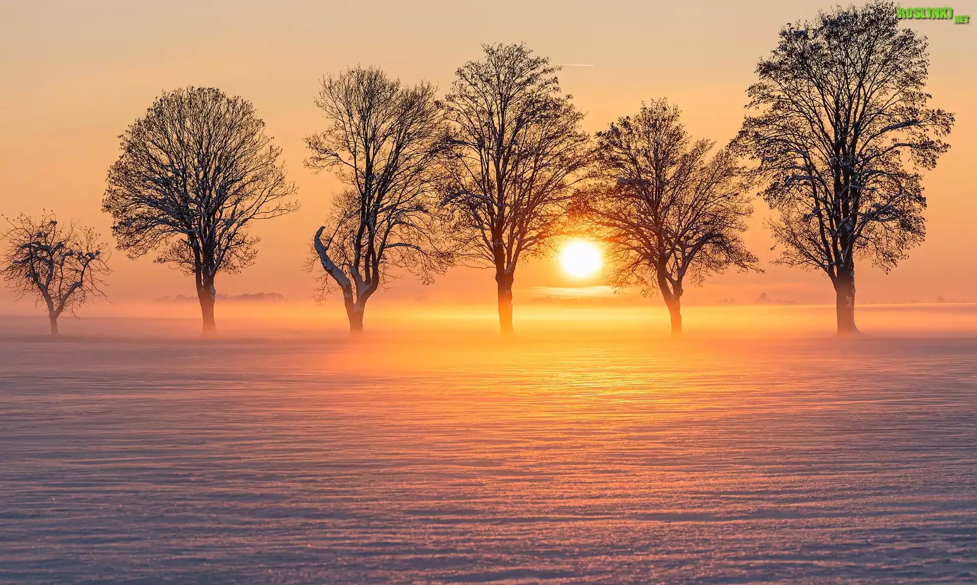 Rośliny: Zima, Drzewa, Mgła, Wschód słońca, Pole