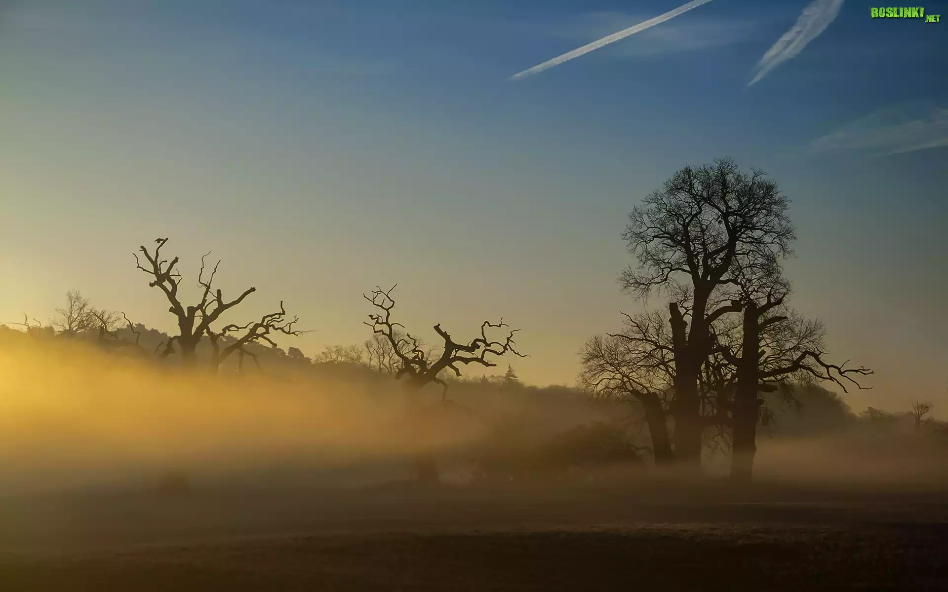 Rośliny: Poranek, Wschód słońca, Mgła, Drzewa, Dęby, Rogalin