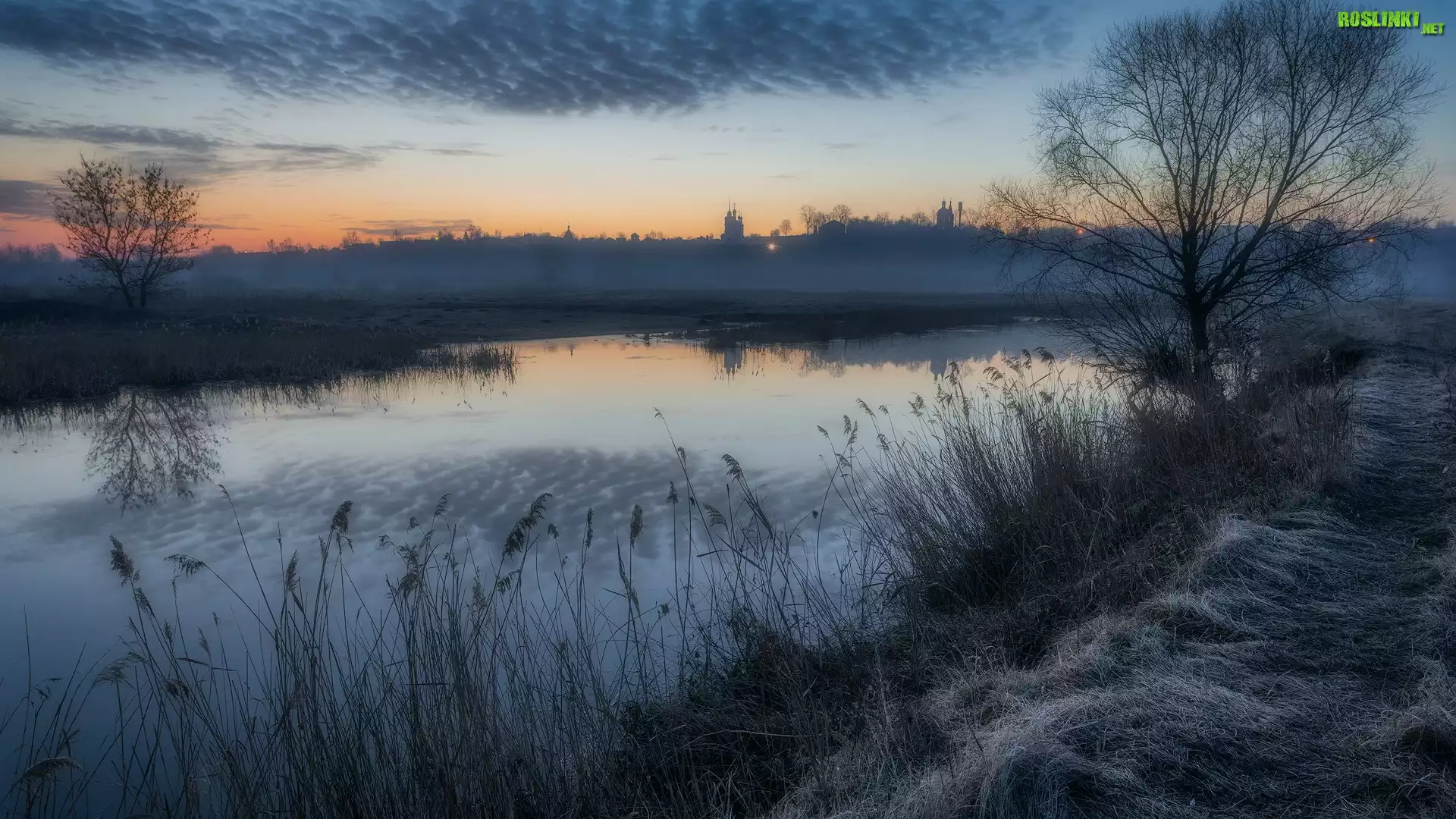 Rośliny: Poranek, Wschód słońca, Rzeka, Mgła, Drzewa, Szuwary