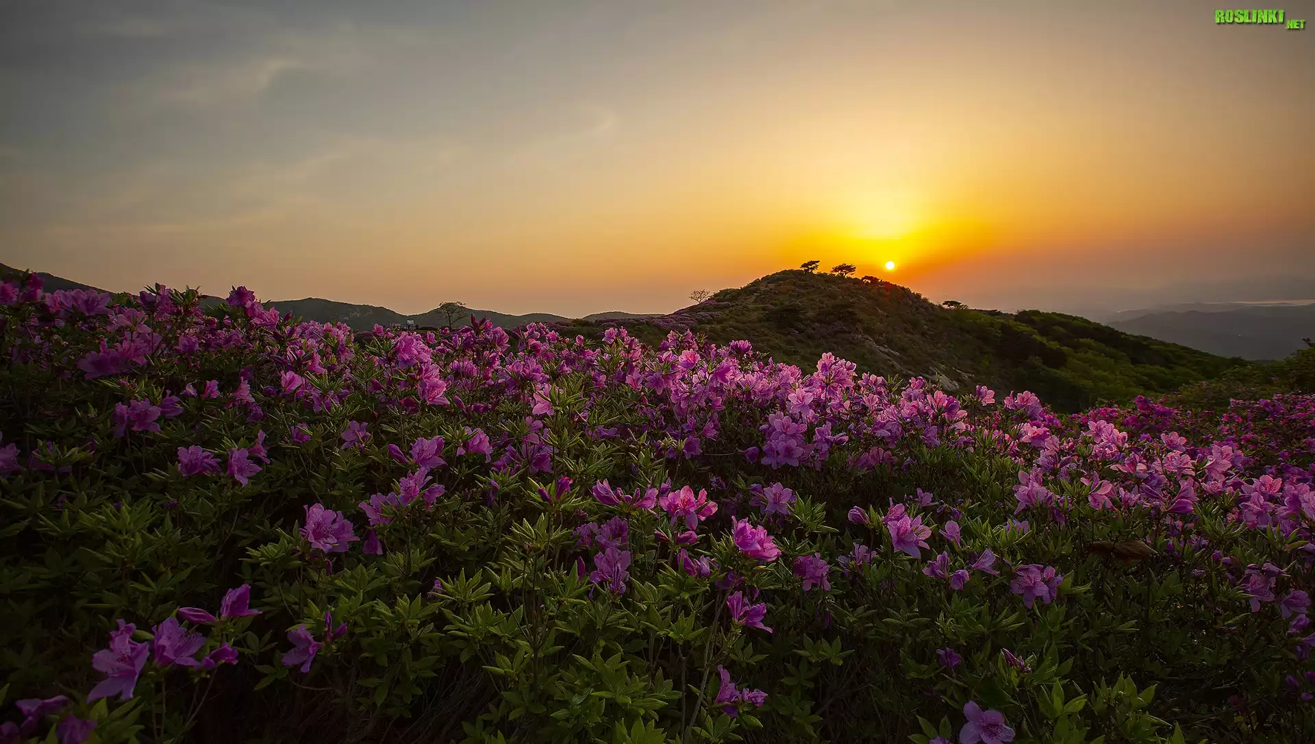 Wschód słońca, Góry, Hwangmae, Purpurowe, Kwiaty, Różanecznik, Korea Południowa