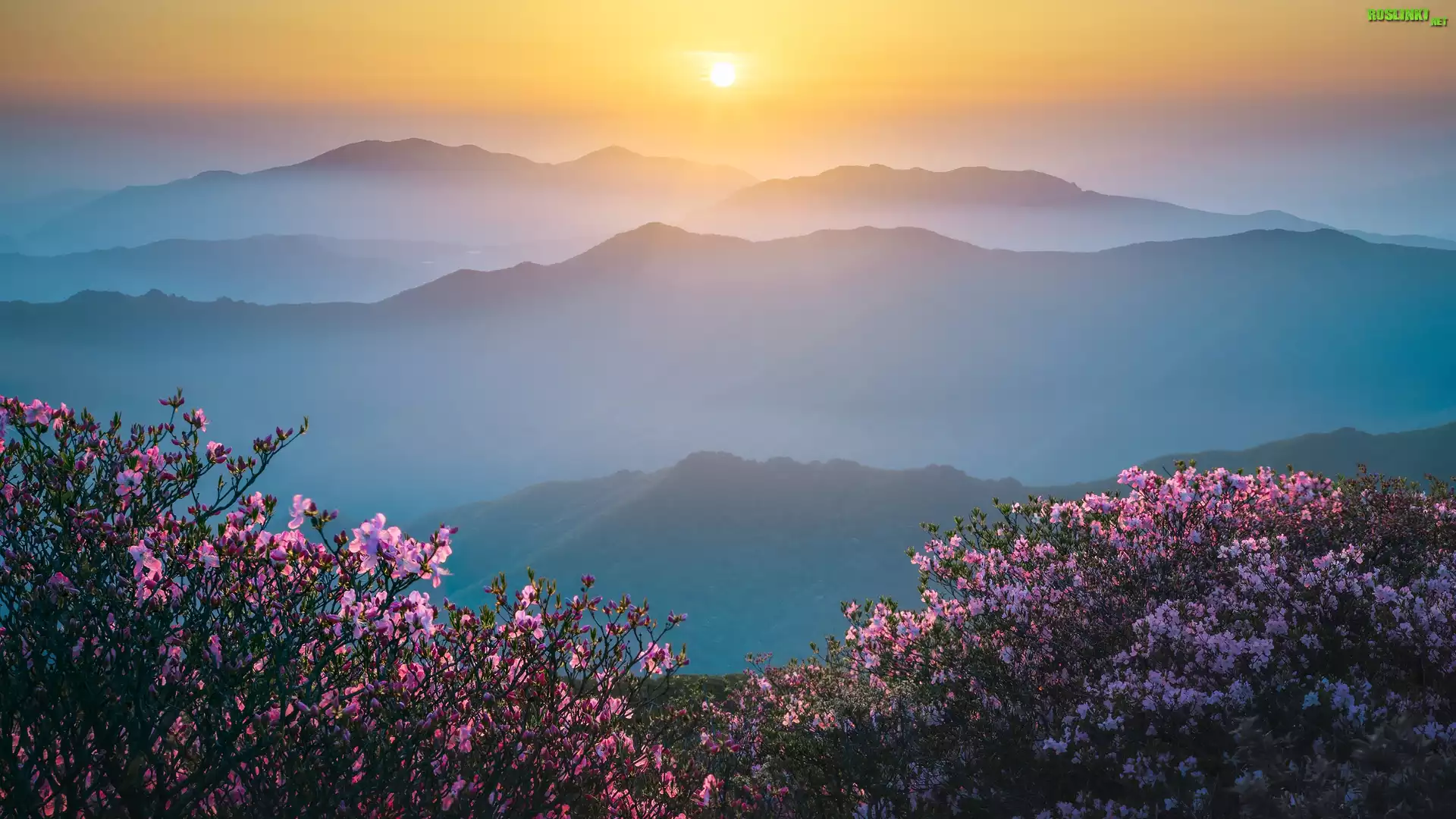 Rośliny: Góry, Wschód słońca, Mgła, Różowe, Kwiaty, Krzewy, Różaneczniki