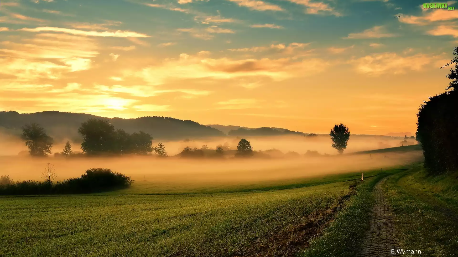 Rośliny: Pole, Wschód słońca, Drzewa, Mgła