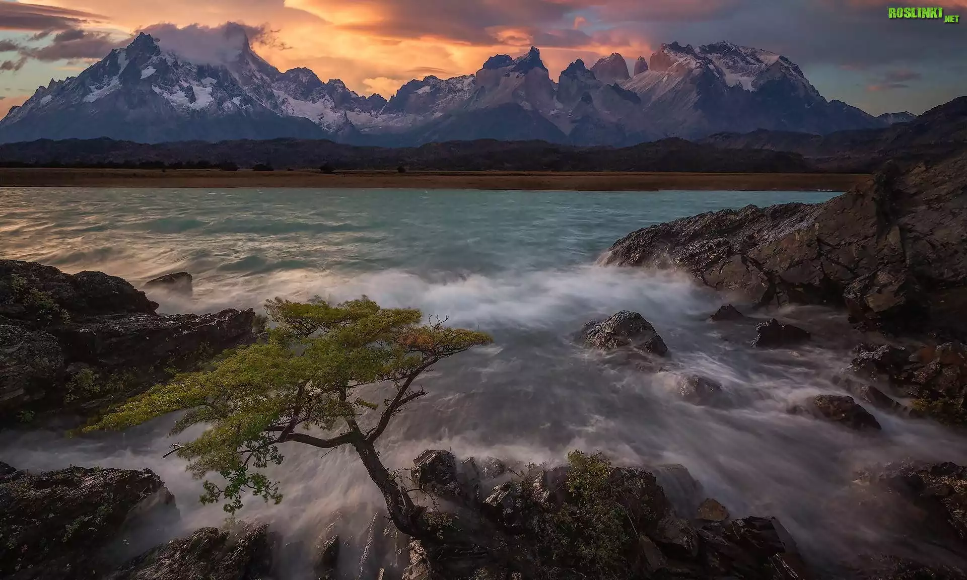 Wschód słońca, Góry, Cordillera del Paine, Jezioro, Pehoe Lake, Skały, Drzewo, Park Narodowy Torres del Paine, Patagonia, Chile |