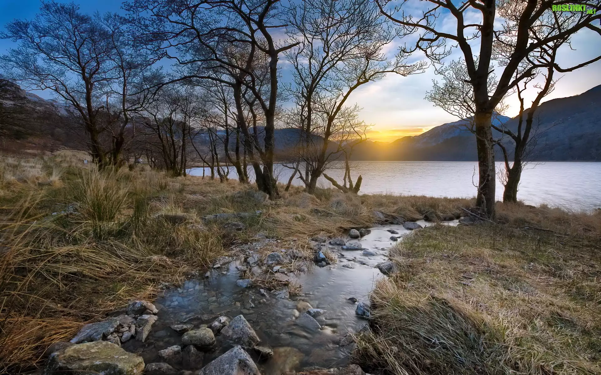 Wschód, Słońca, Jezioro, Strumyk, Drzewa
