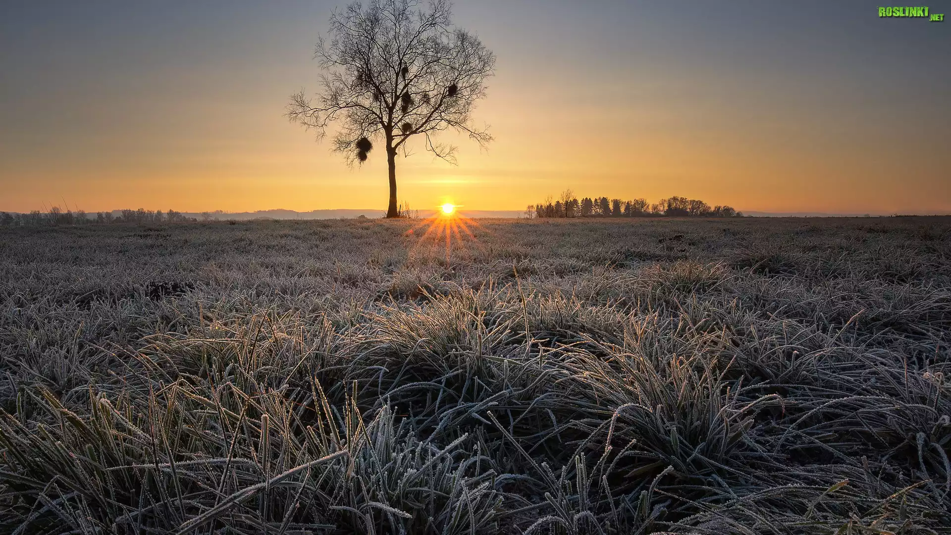 Rośliny: Łąka, Trawa, Szron, Wschód słońca, Drzewo, Niebo