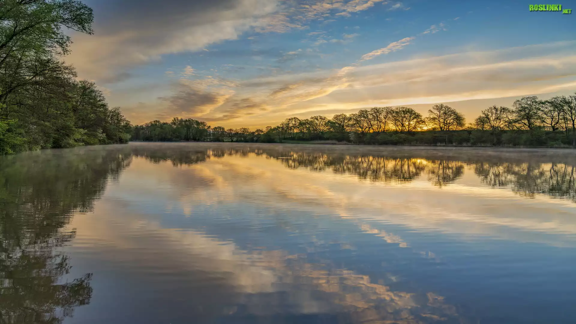 Rośliny: Wschód słońca, Chmury, Drzewa, Odbicie, Jezioro Sterenbachsee, Dolina Wittlicha, Niemcy