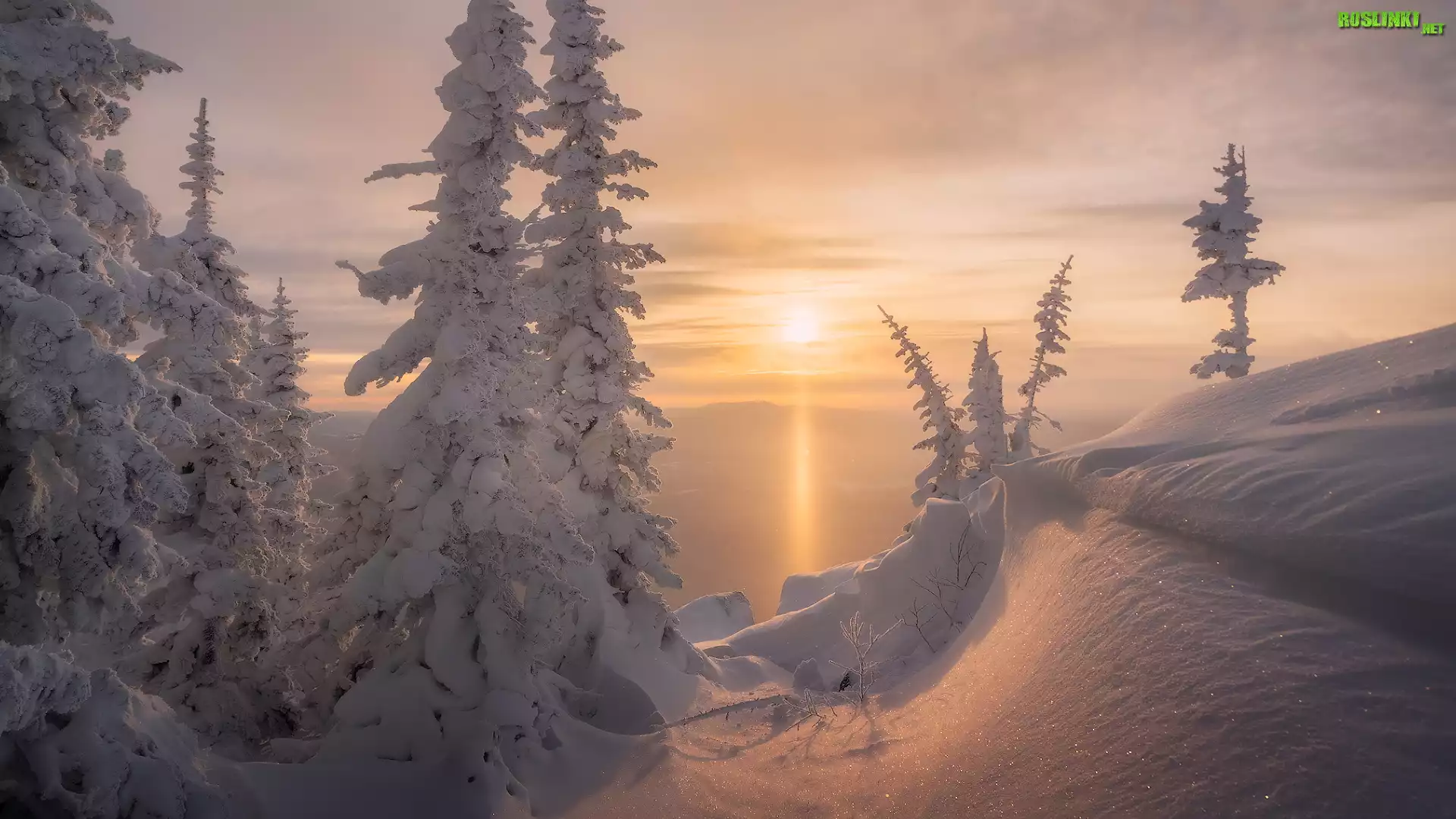 Rośliny: Wschód słońca, Zima, Śnieg, Zaśnieżone, Drzewa