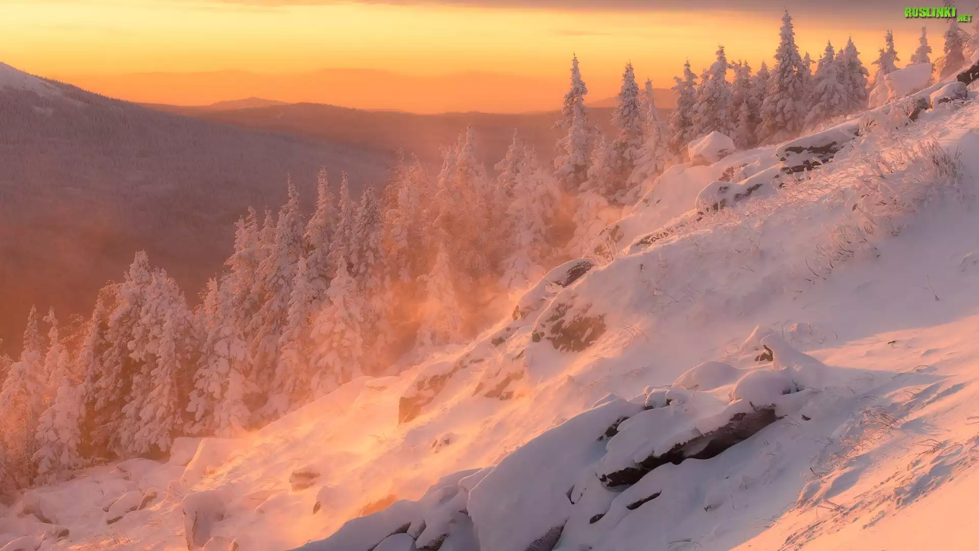 Rośliny: Zima, Wschód słońca, Góry, Ośnieżone, Drzewa, Świerki