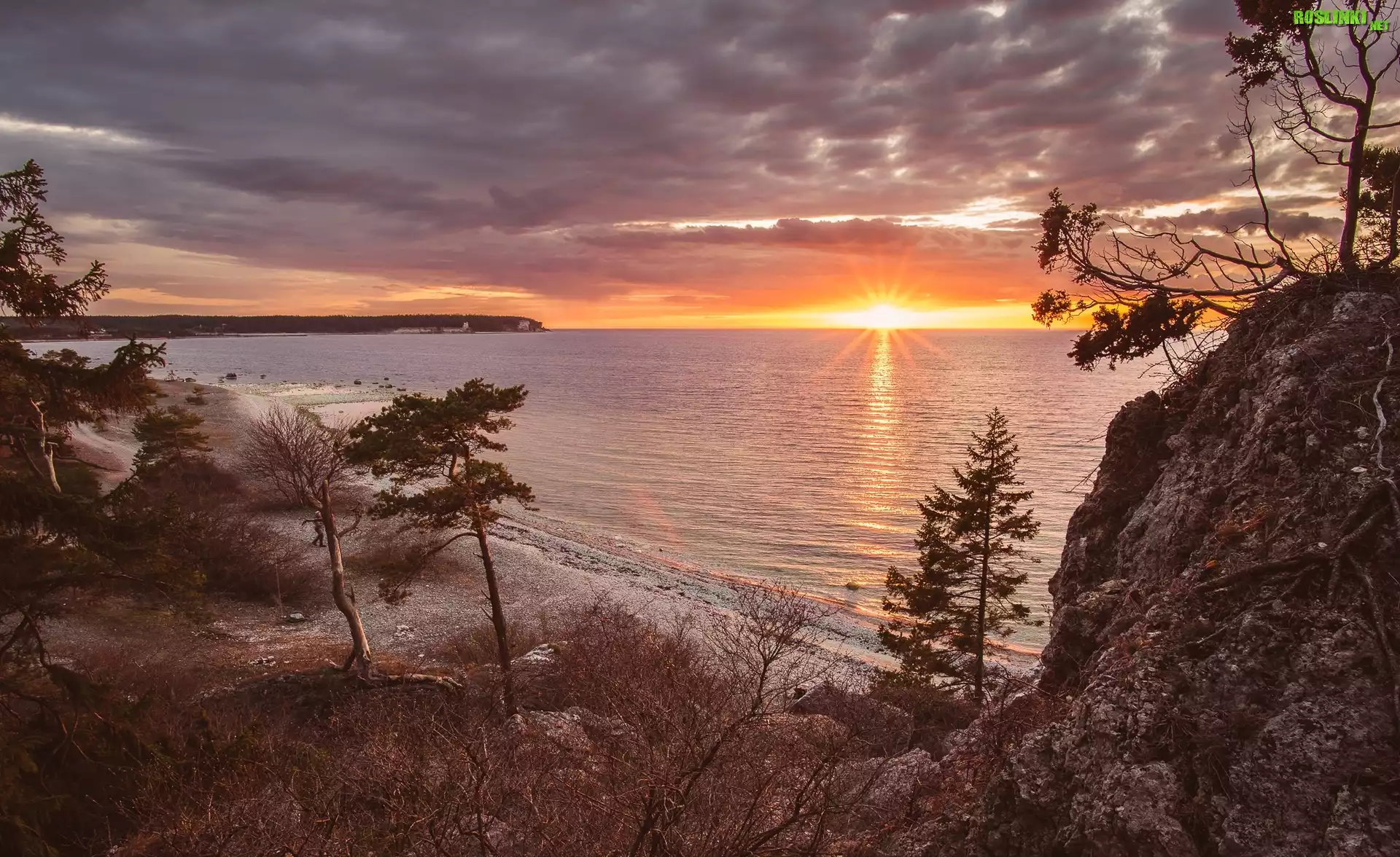 Rośliny: Wybrzeże, Skały, Drzewa, Zachód słońca, Chmury