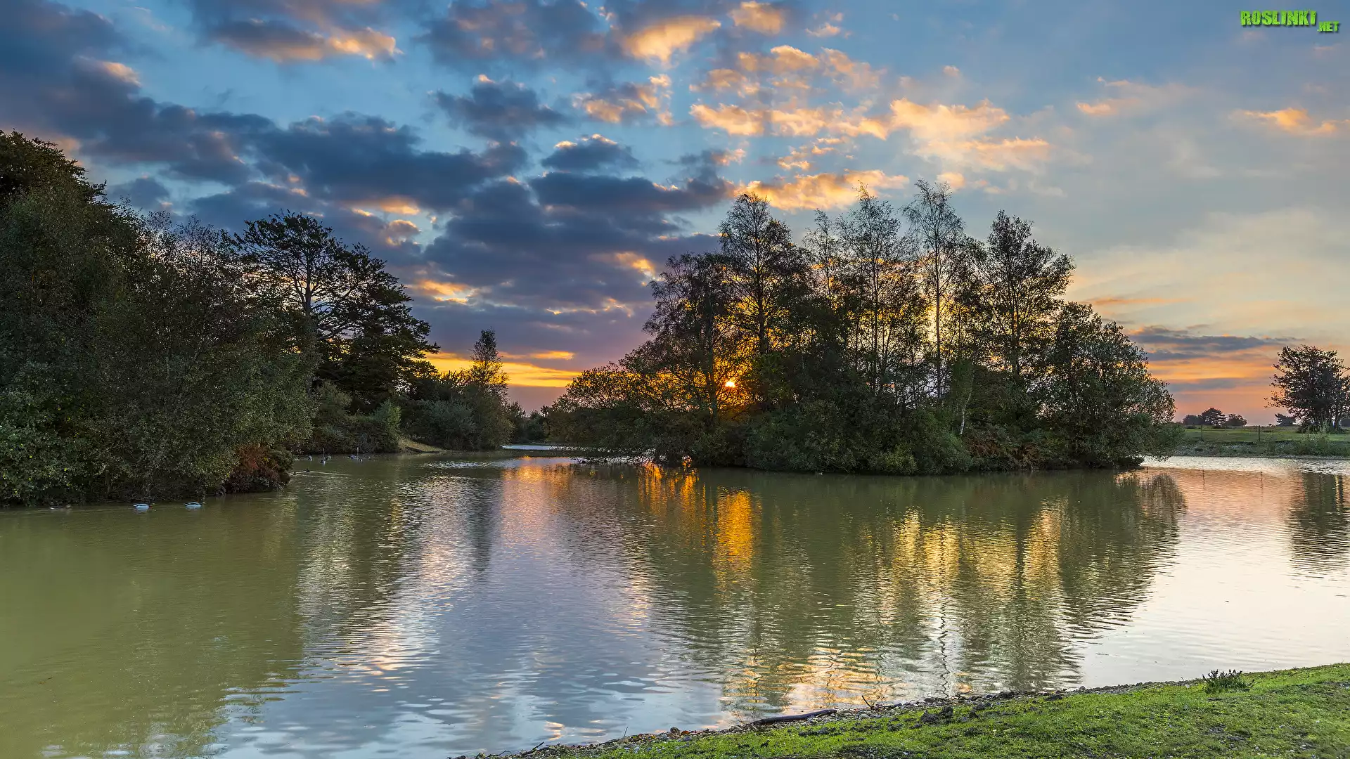 Rośliny: Jezioro, Wysepka, Wschód słońca, Chmury, Niebo, Drzewa, Trawa