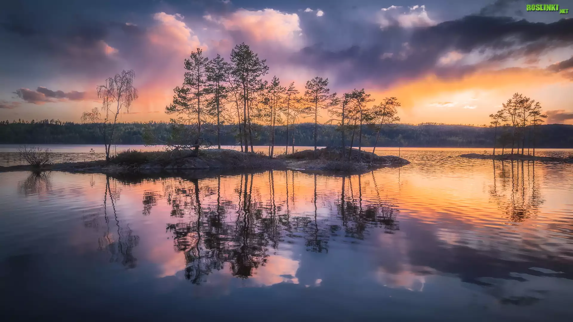 Rośliny: Jezioro, Wysepki, Drzewa, Zachód słońca, Ringerike, Norwegia