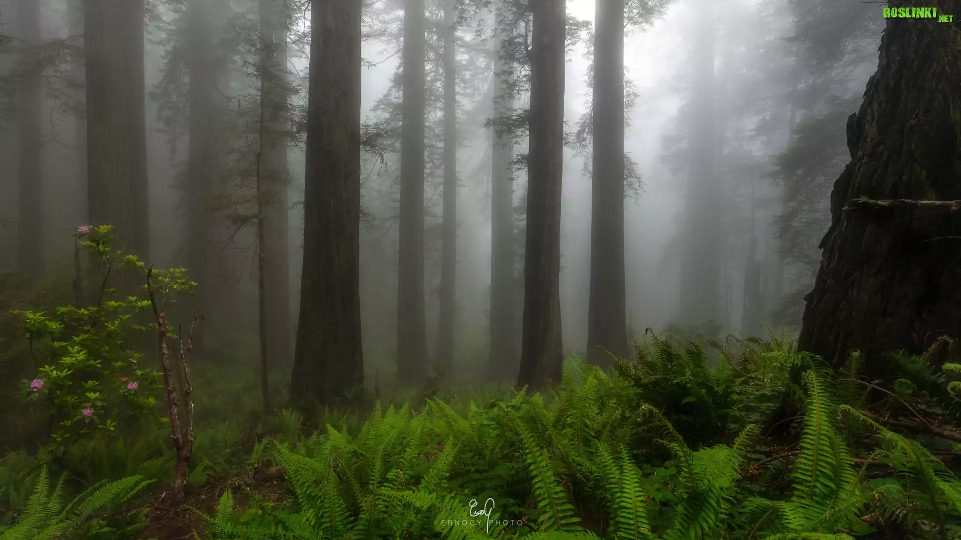 Rośliny: Las, Wysokie, Drzewa, Mgła, Paprocie