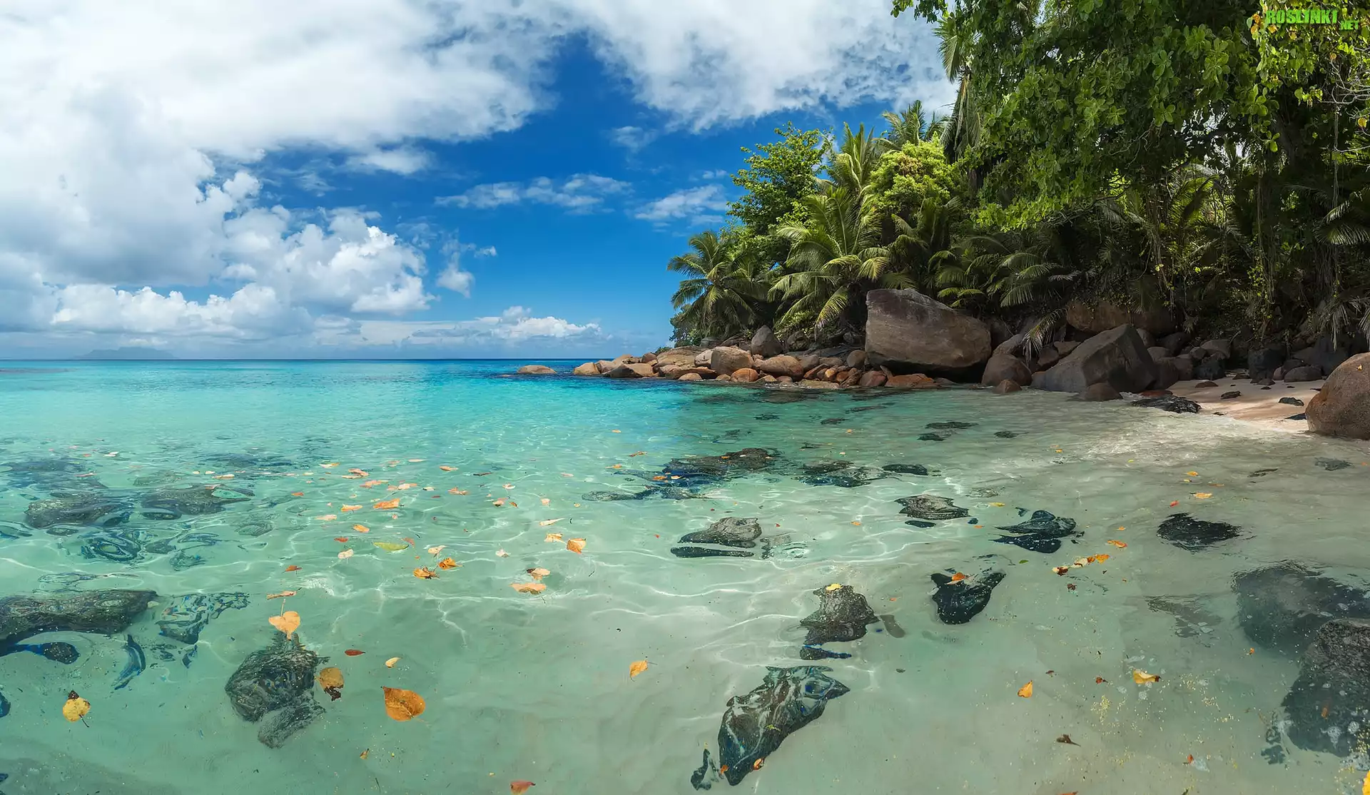 Rośliny: Seszele, Wyspa Mahe, Morze, Głazy, Palmy, Roślinność, Chmury