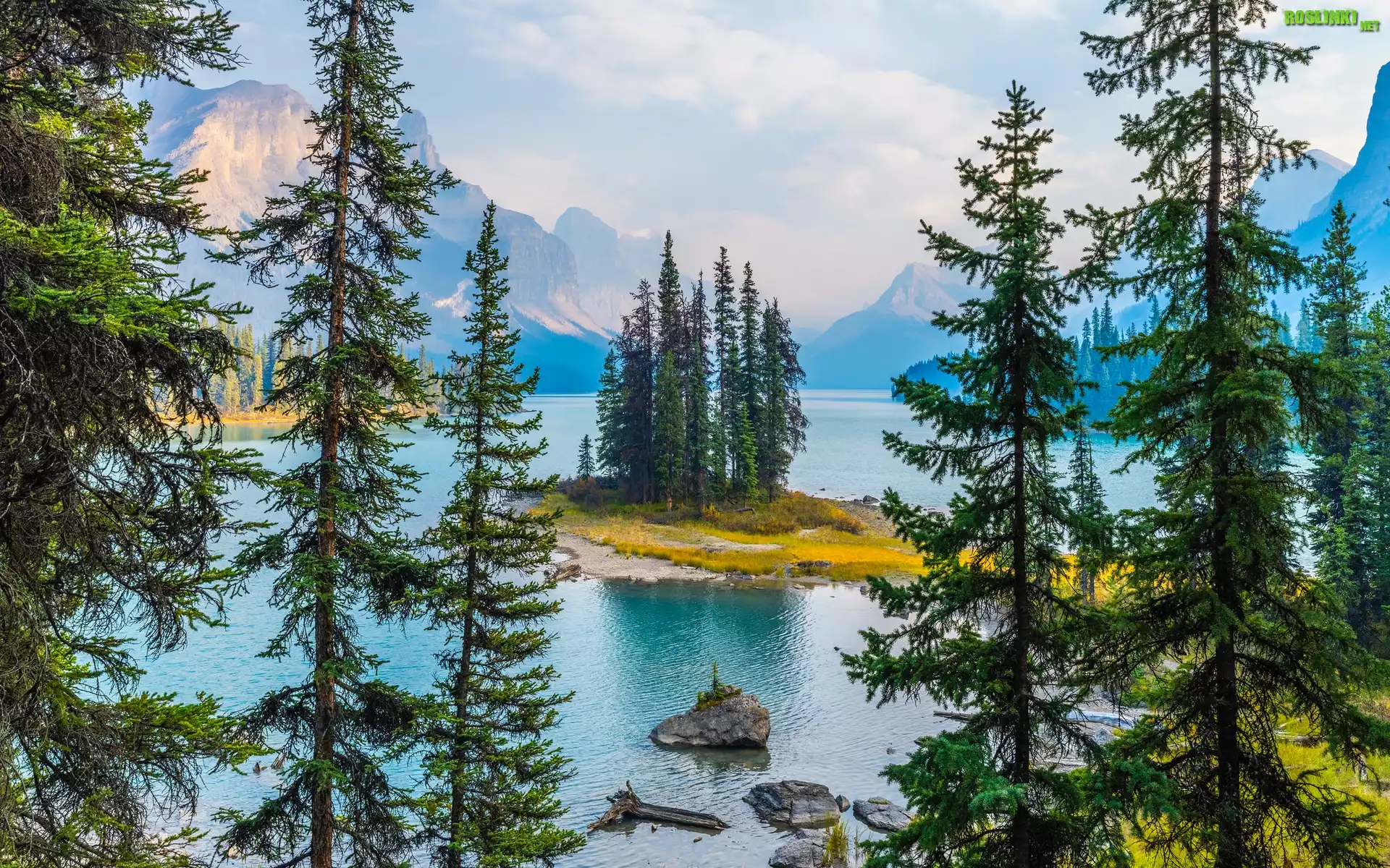 Rośliny: Kanada, Park Narodowy Jasper, Drzewa, Góry, Jezioro, Maligne Lake, Wyspa Spirit Island