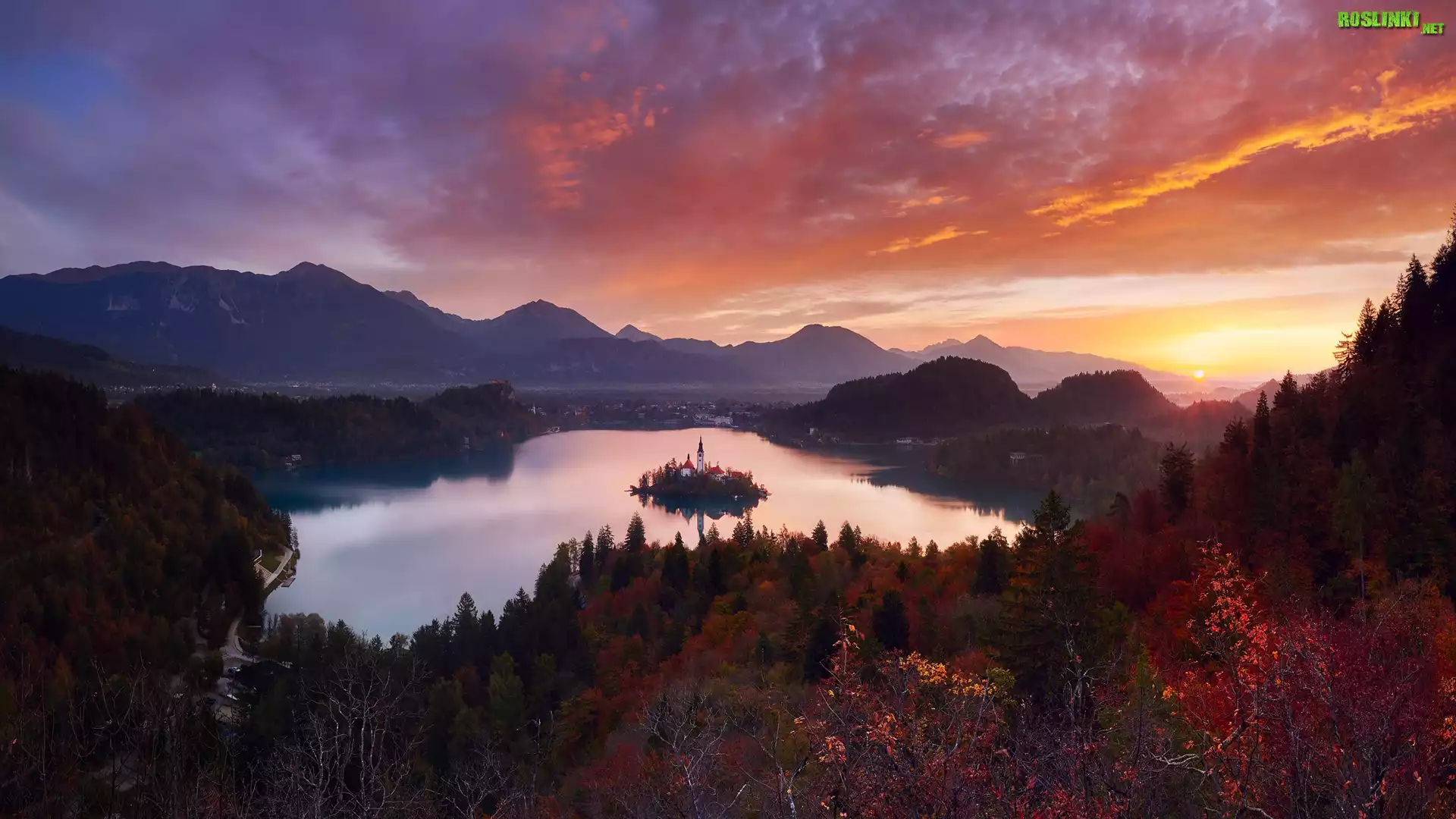 Wyspa Blejski Otok, Jezioro Bled, Kościół Wniebowzięcia Marii Panny, Góry, Drzewa, Chmury, Zachód słońca, Słowenia |