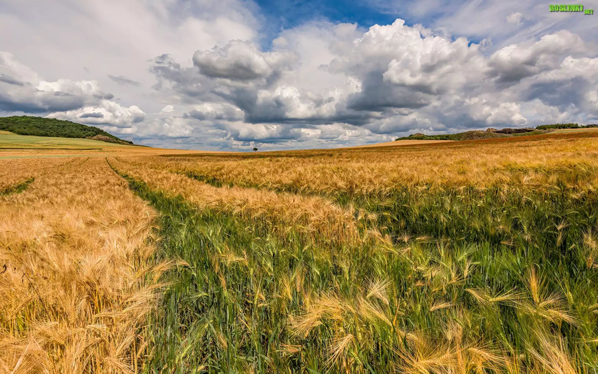 Rośliny: Pole, Zboże, Kłosy, Wzgórza, Niebo, Chmury