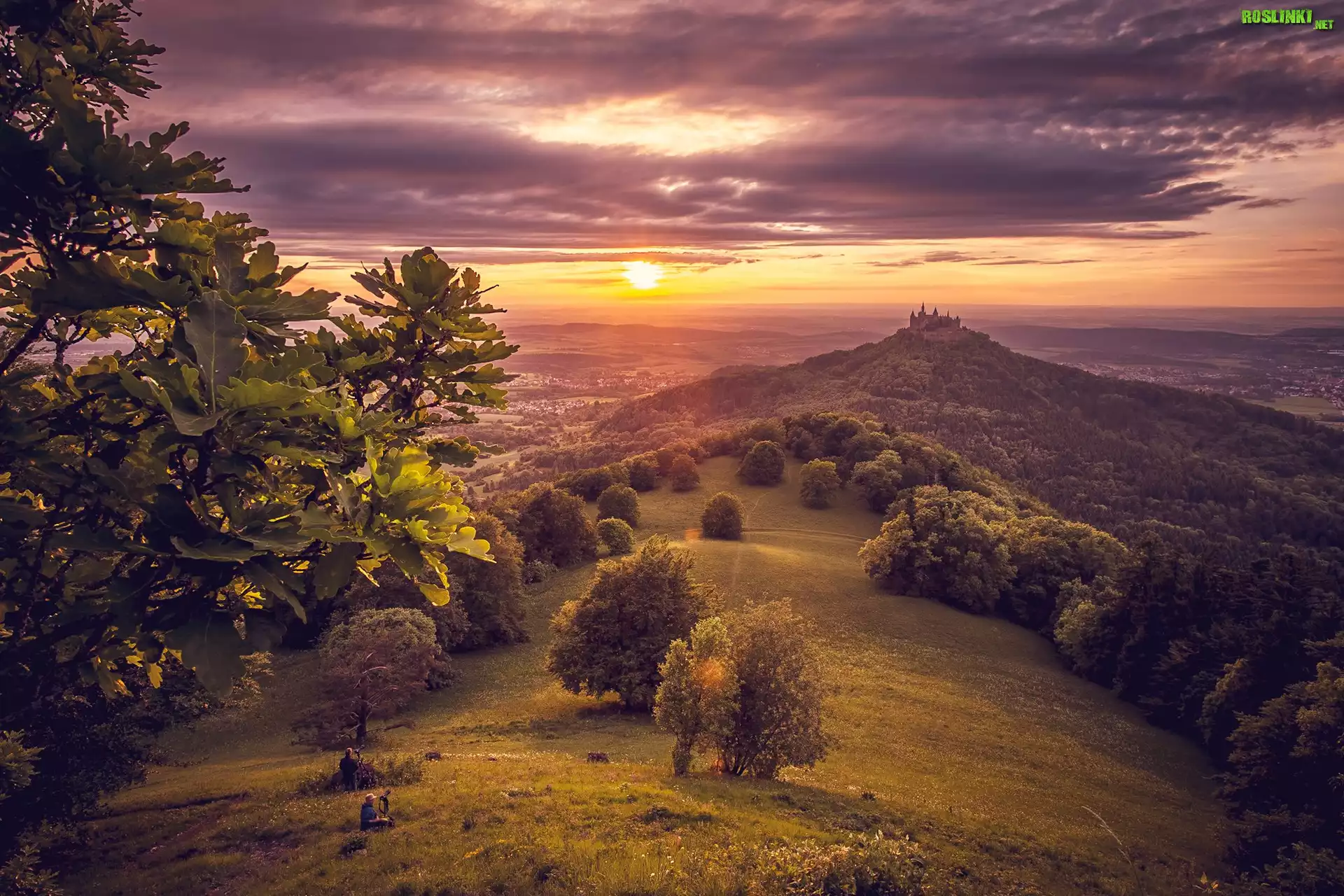 Rośliny: Niemcy, Wzgórza, Zamek Hohenzollern, Drzewa, Wschód słońca, Chmury