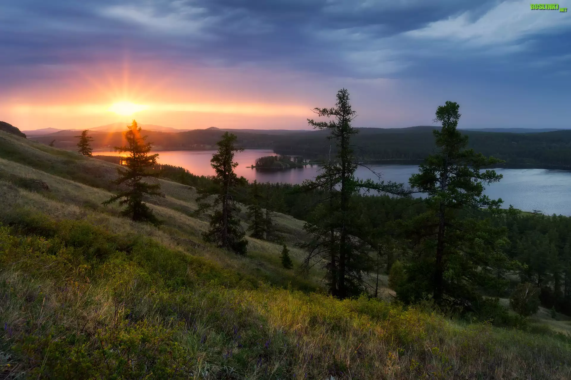 Rośliny: Rzeka, Wzgórza, Las, Drzewa, Wysepka, Wschód słońca, Chmury