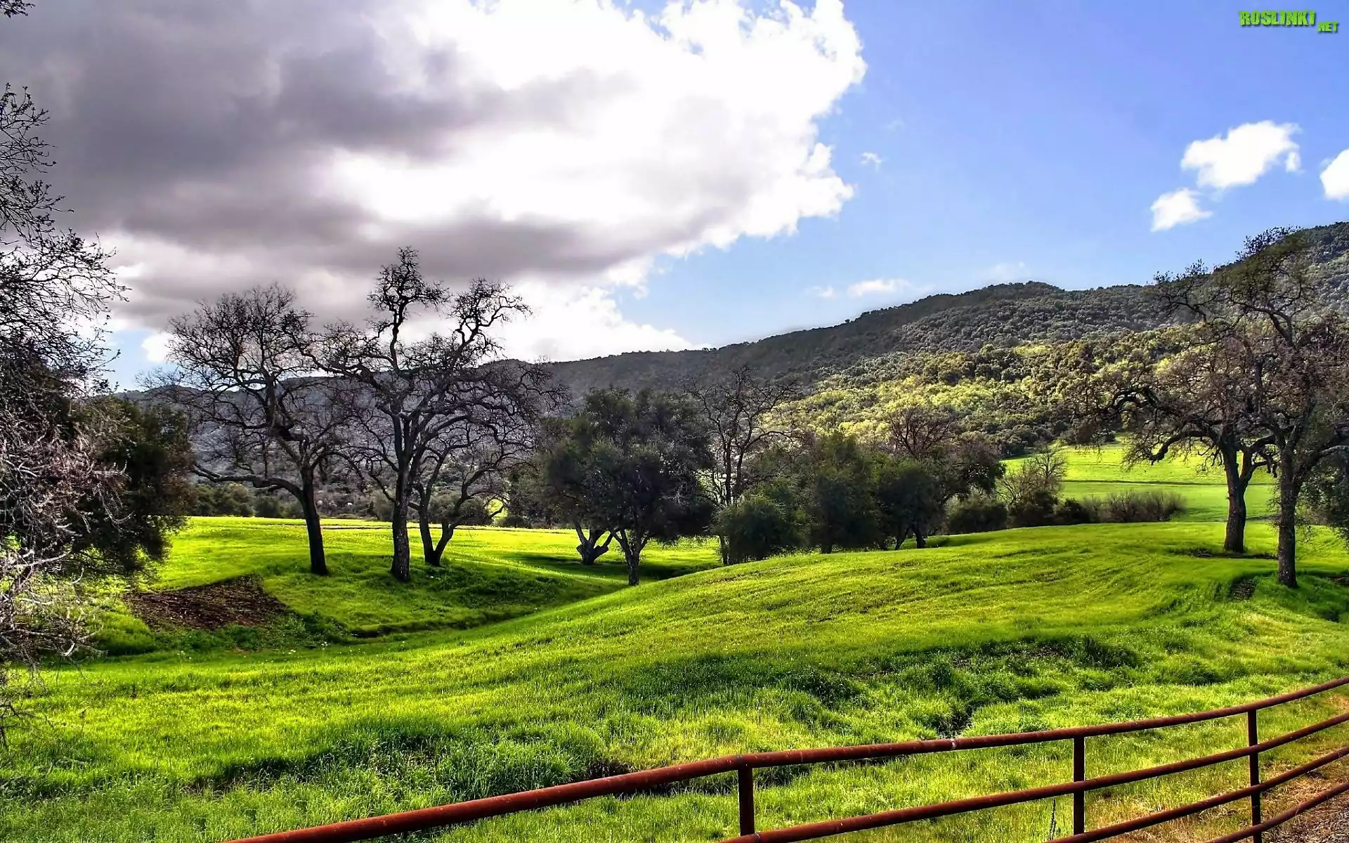 Rośliny: Chmury, Wzgórza, Lasy, Łąka, Drzewa, Ogrodzenie, Światło, Cień