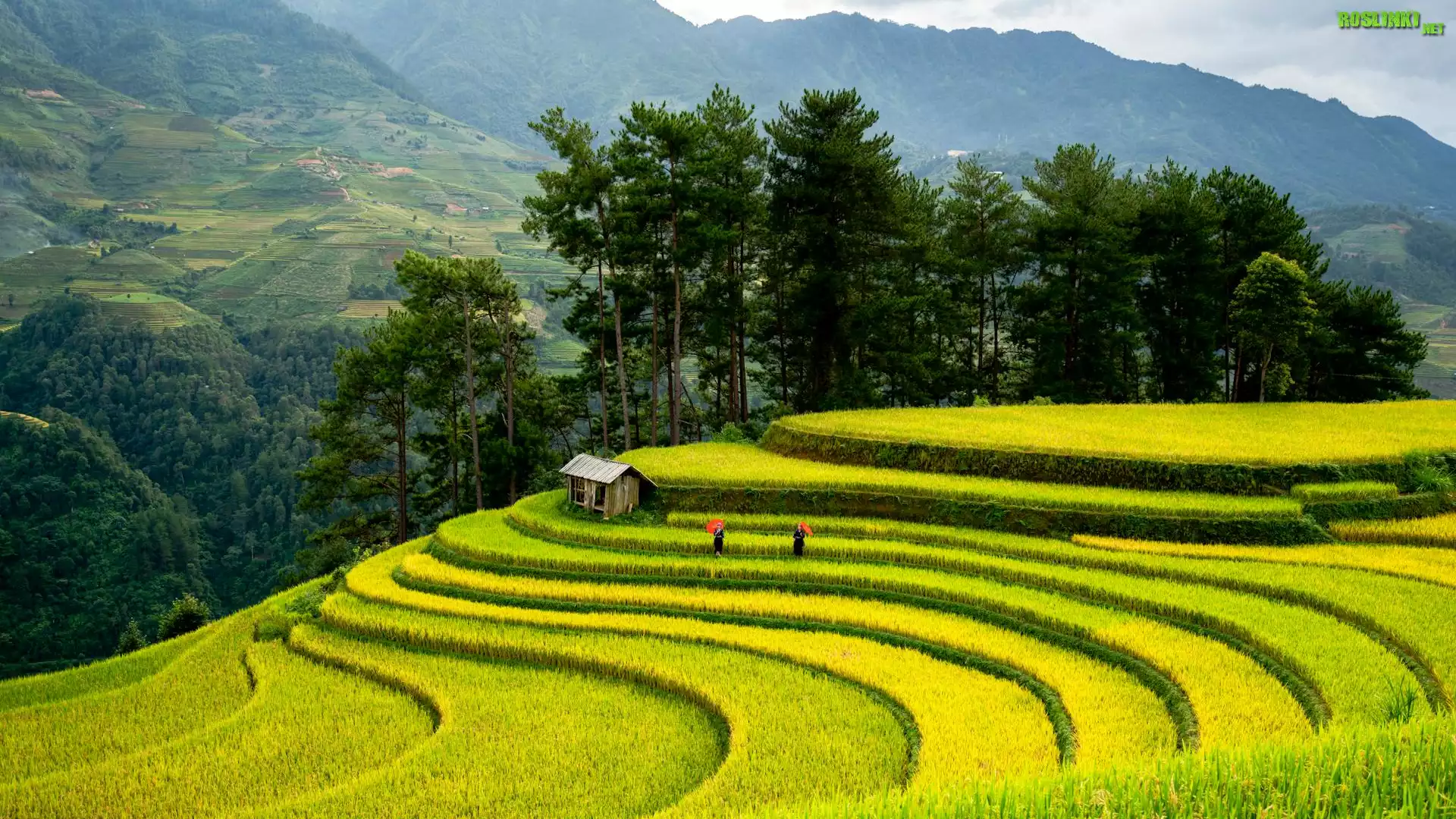 Rośliny: Wzgórza, Góry, Pola uprawne, Tarasy ryżowe, Drewniana, Szopa, Drzewa