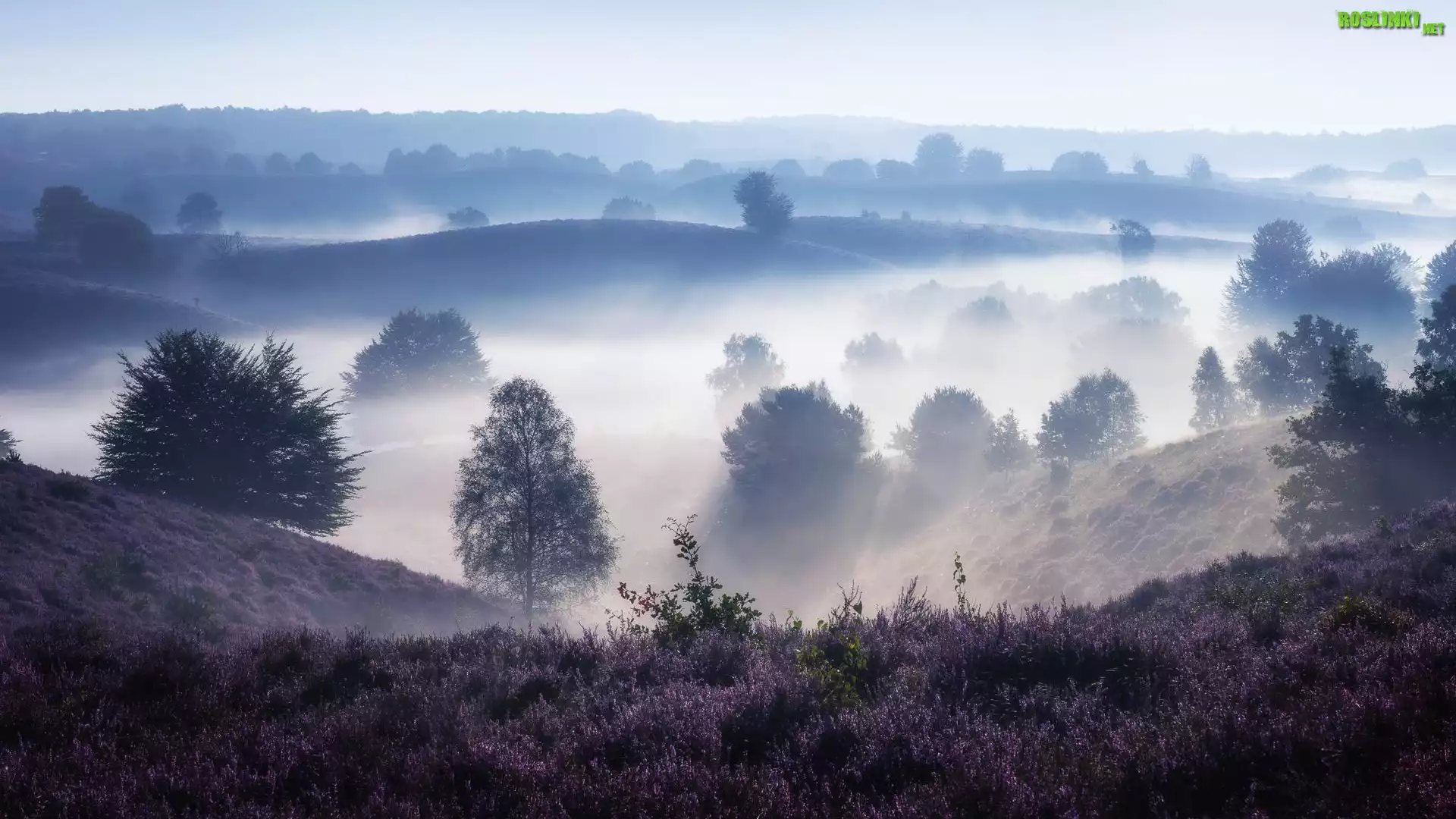 Rośliny: Wzgórza, Wrzosowisko, Drzewa, Mgła