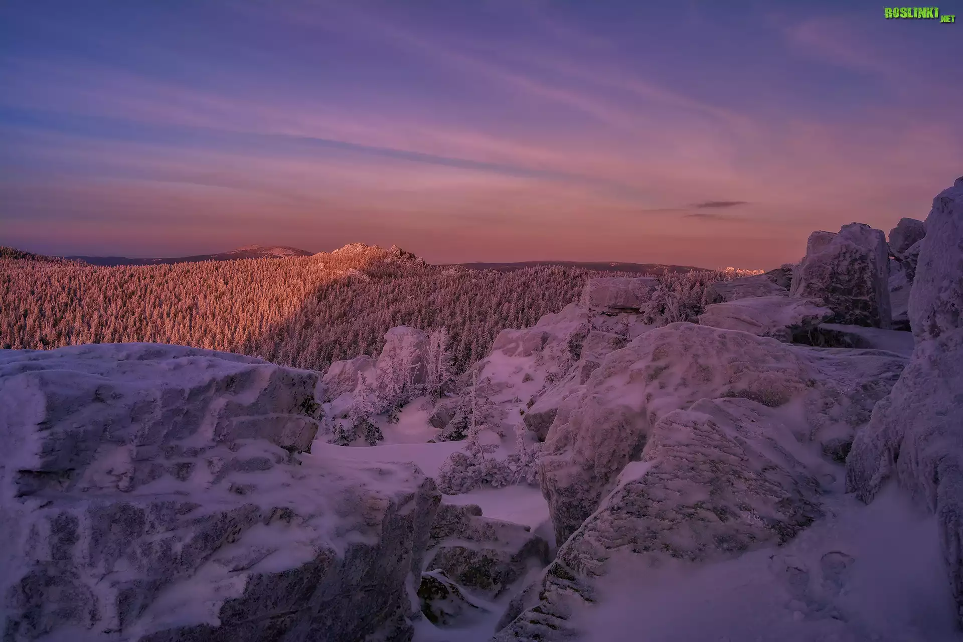 Wzgórza, Góry, Skały, Drzewa, Zima, Zachód słońca, Park Narodowy Taganaj, Obwód czelabiński, Rosja |