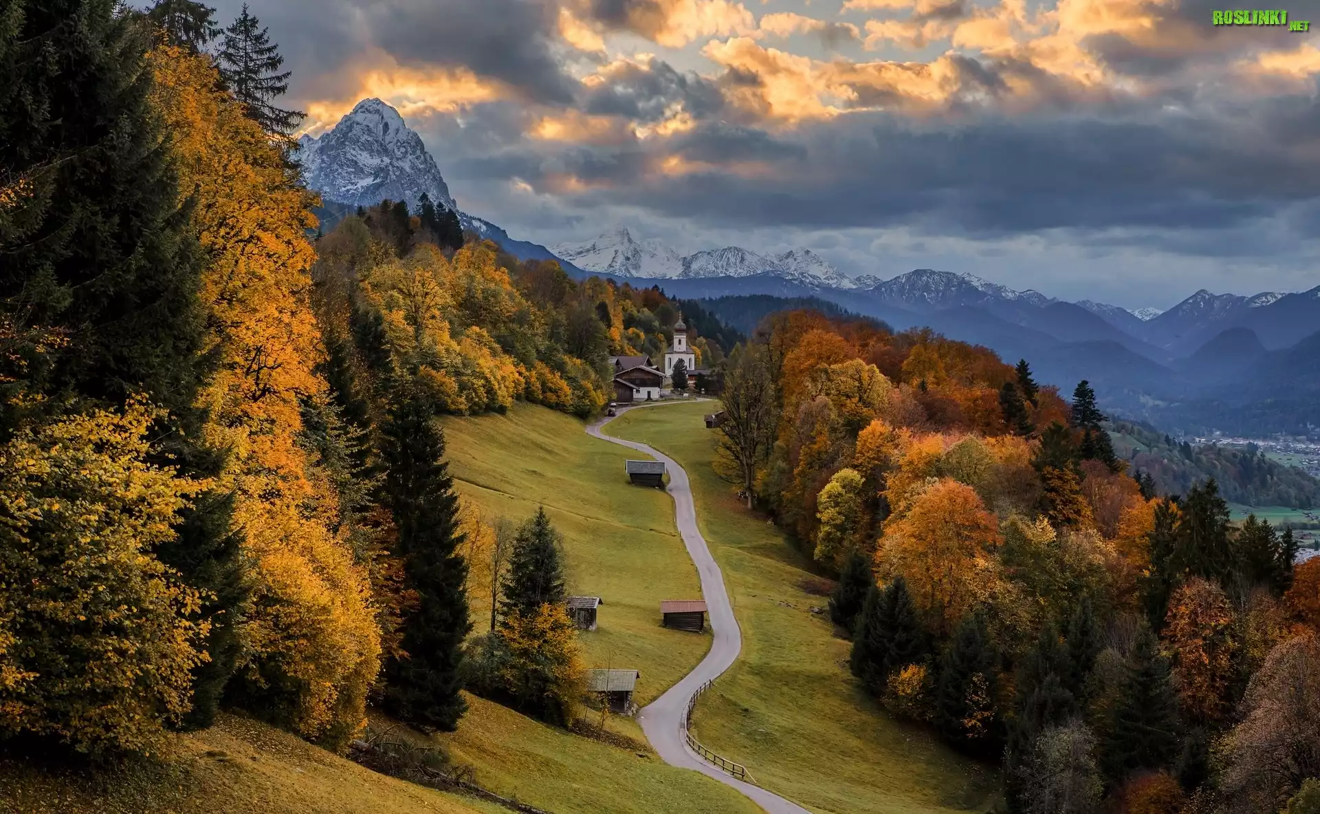 Rośliny: Wieś Wamberg, Góry, Wzgórza, Droga, Kościół św Anny, Drzewa, Jesień, Chmury, Bawaria, Niemcy