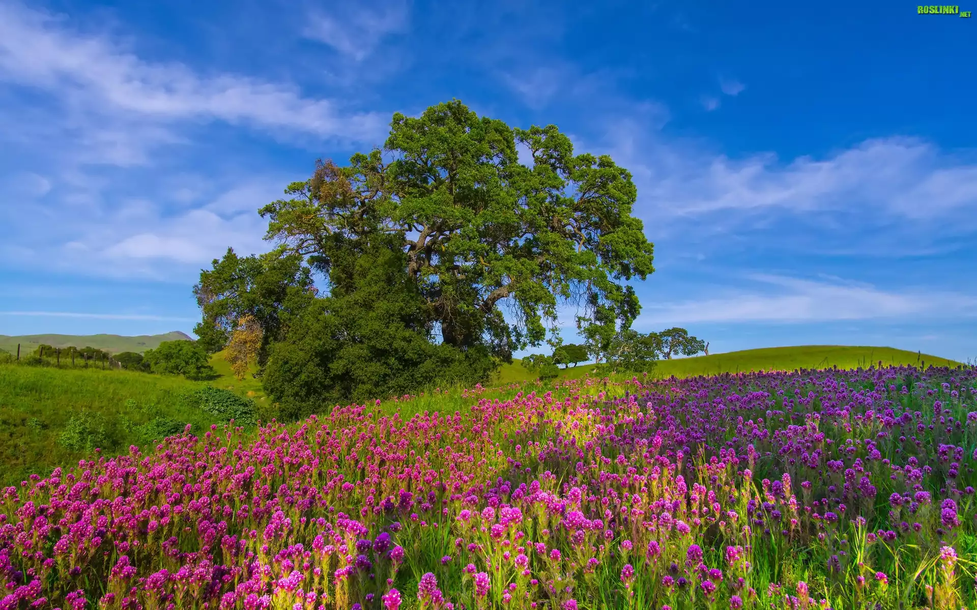 Wzgórza, Drzewa, Kwiaty, Łąka