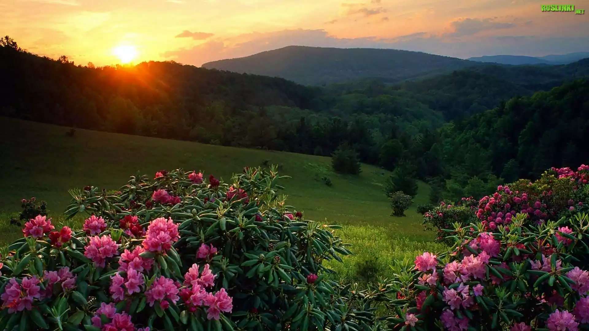 Rośliny: Wzgórza, Lasy, Zachód, Słońca, Kwitnące, Rododendrony