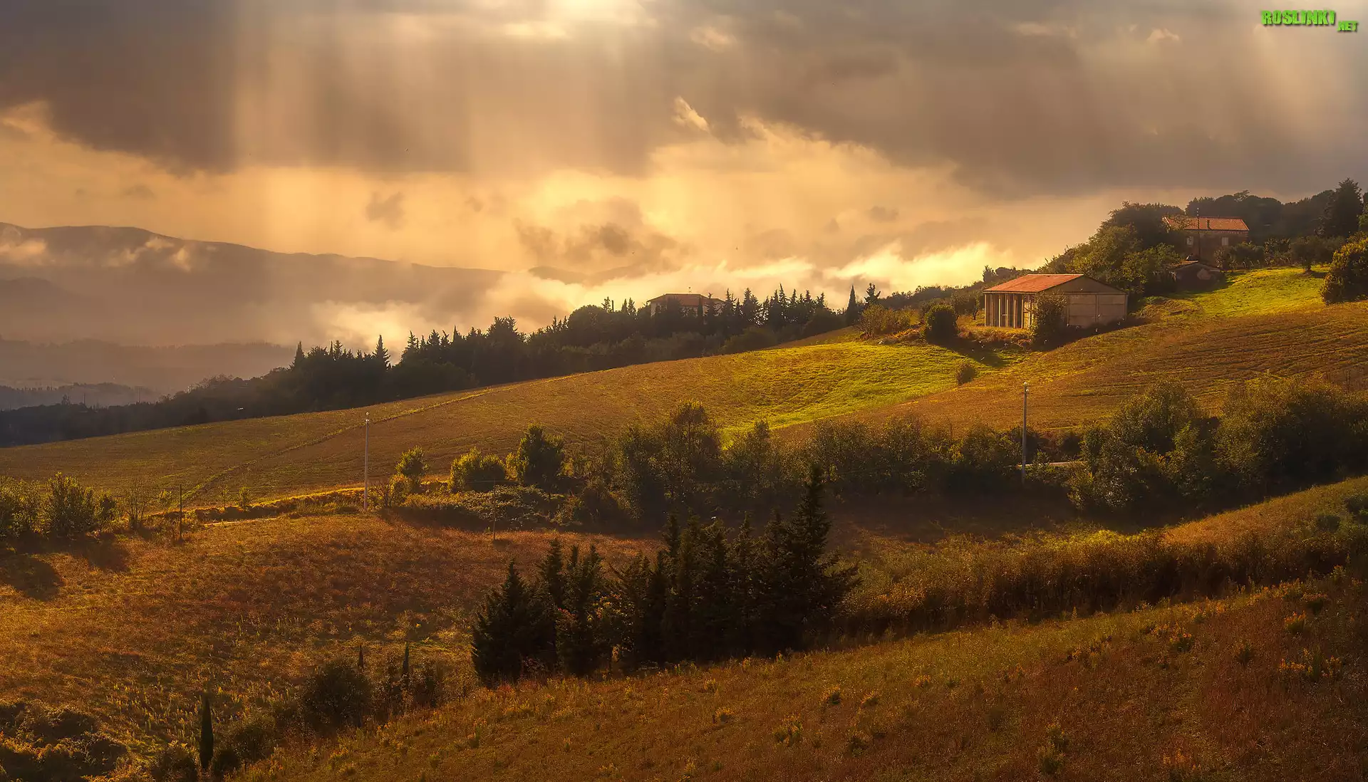 Rośliny: Wzgórza, Drzewa, Domy, Chmury, Przebijające Światło