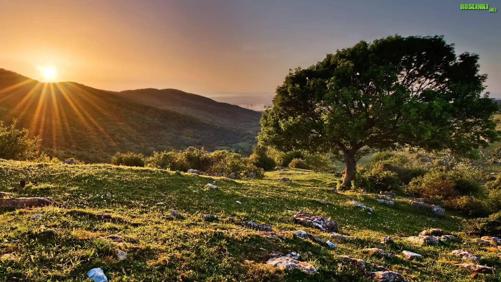 Rośliny: Wzgórza, Drzewa, Wschód Słońca, Promienie
