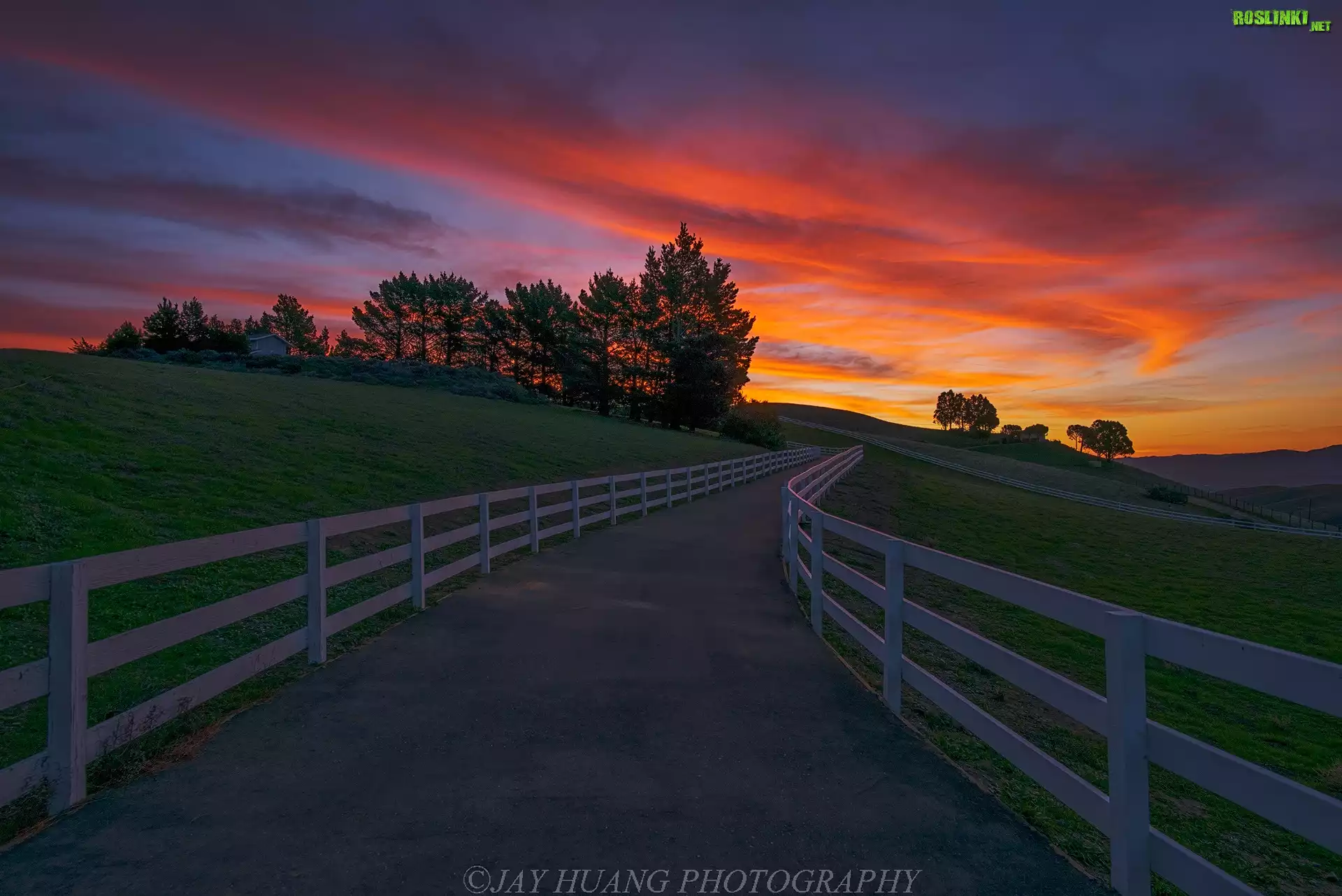 Rośliny: Wzgórza, Droga, Ogrodzenie, Drzewa, Zachód słońca