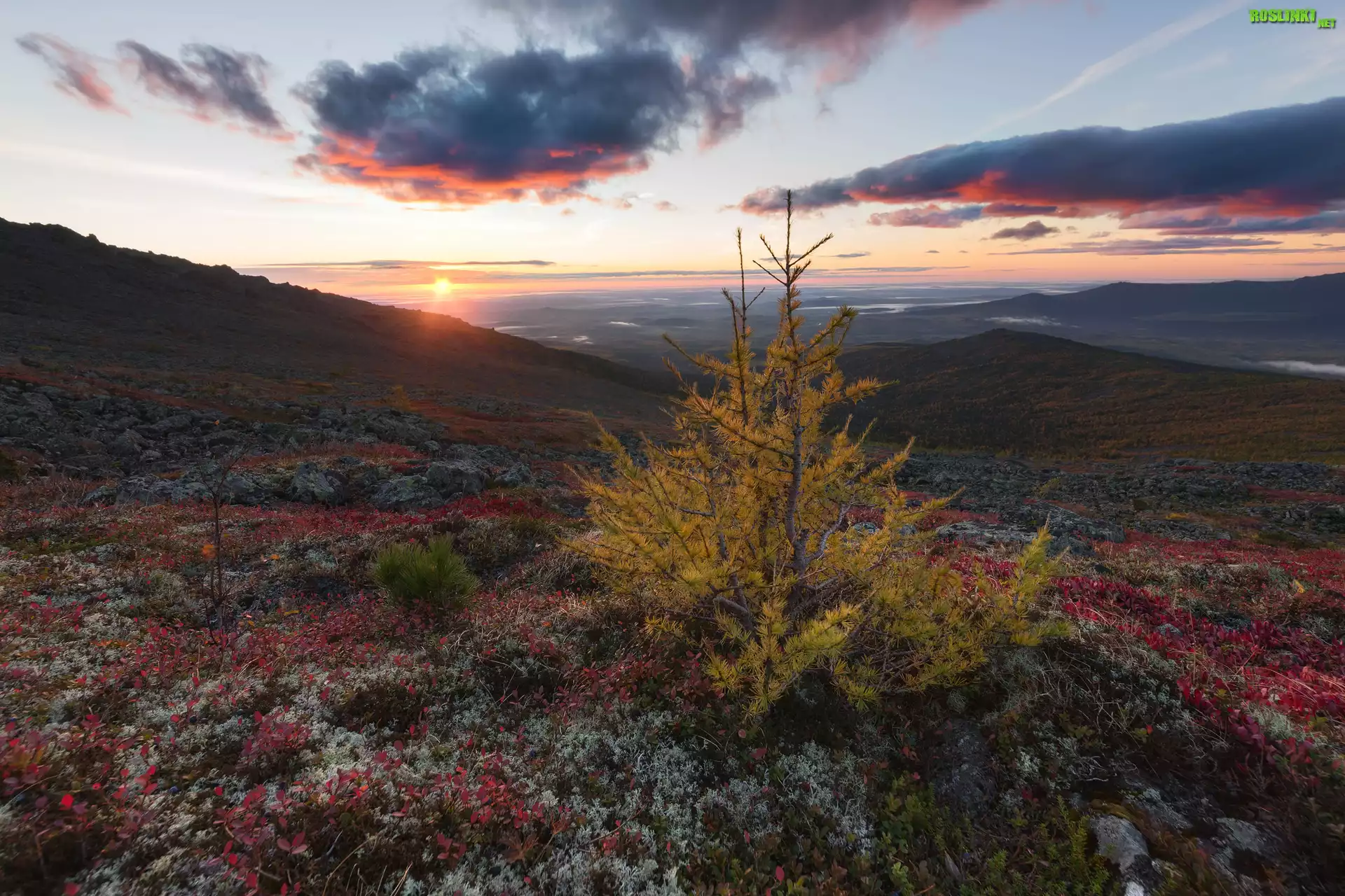 Rośliny: Wzgórza, Drzewka, Rośliny, Chmury, Zachód słońca