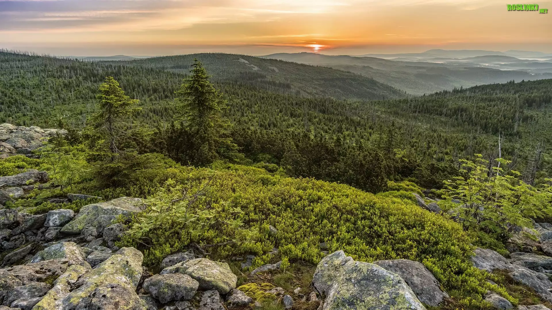 Rośliny: Zalesione, Wzgórza, Góry, Drzewa, Kamienie, Wschód słońca