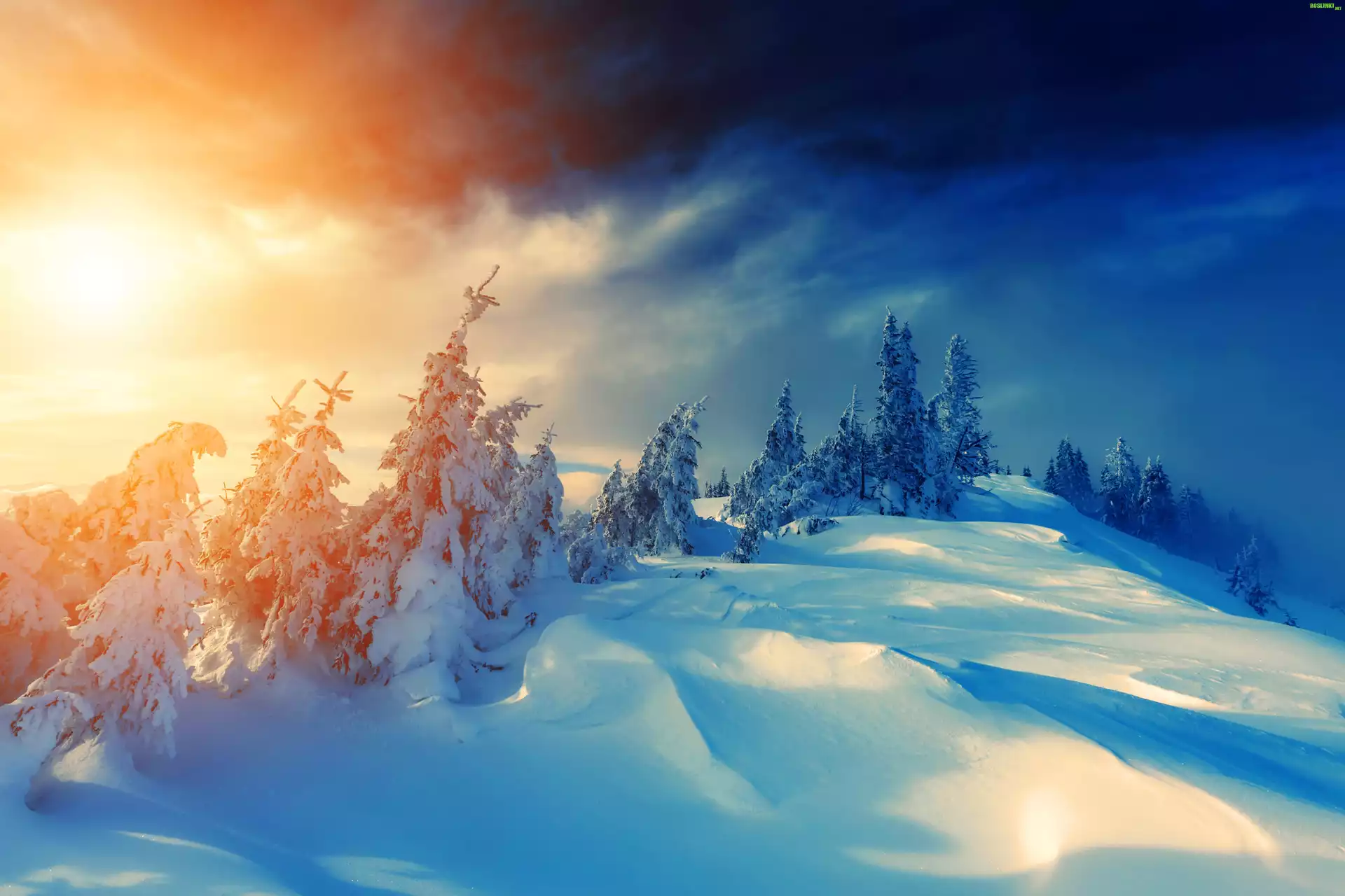 Rośliny: Zima, Wzgórza, Ośnieżone, Drzewa, Zachód, Słońca, Śnieg
