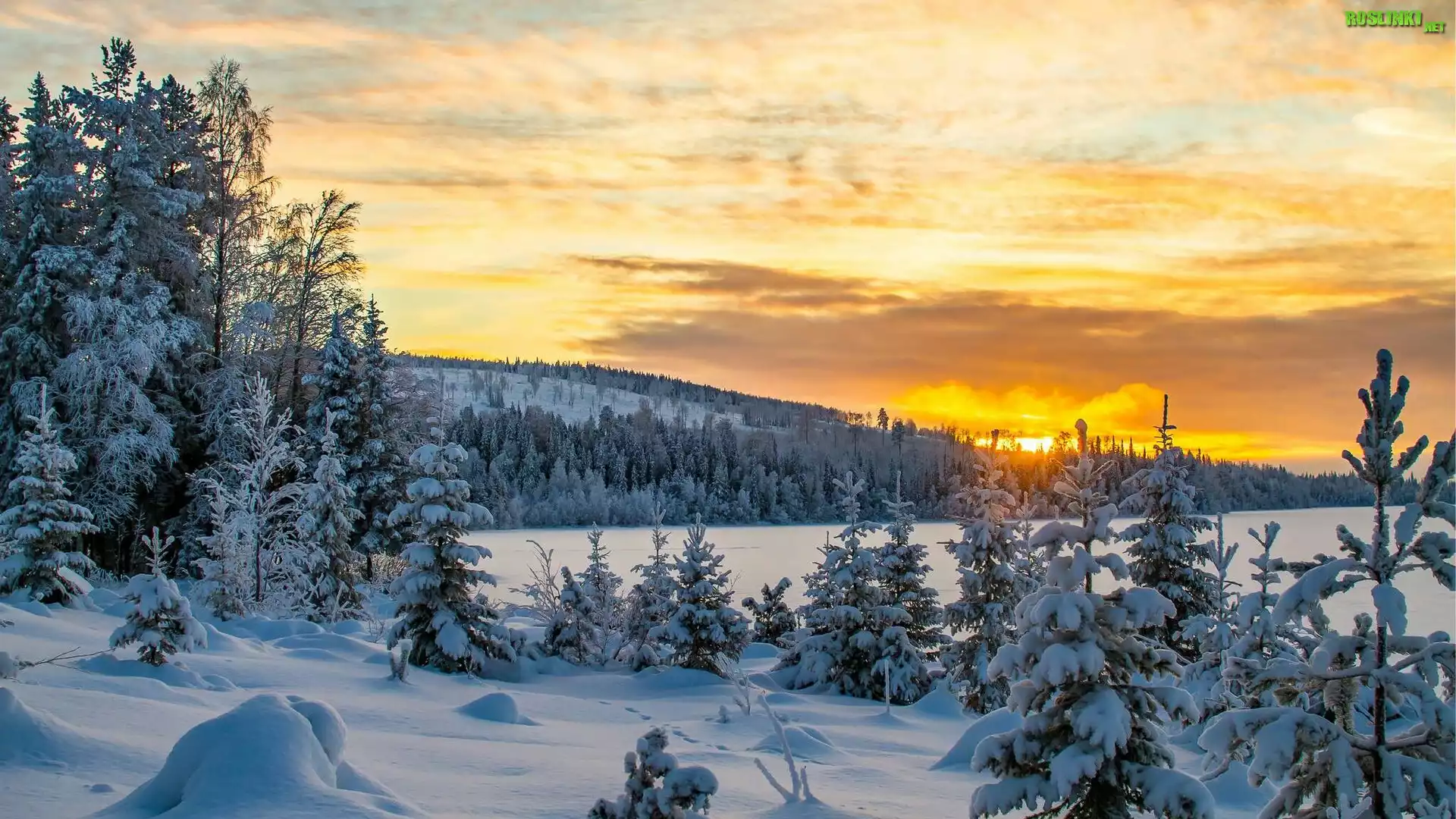 Rośliny: Zima, Wzgórza, Drzewa, Świerki, Zachód słońca, Śnieg